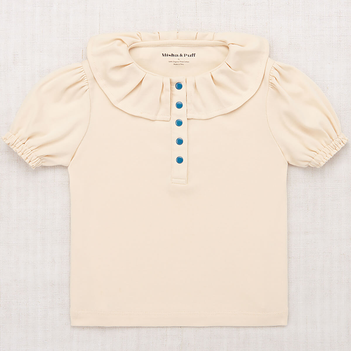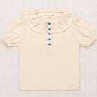 Ulla Tee by Misha & Puff. A short-sleeved top in Pima cotton, featuring puff sleeves with soft elasticated cuffs, a pleated collar, and partial snap button front closure. A great style for layering.