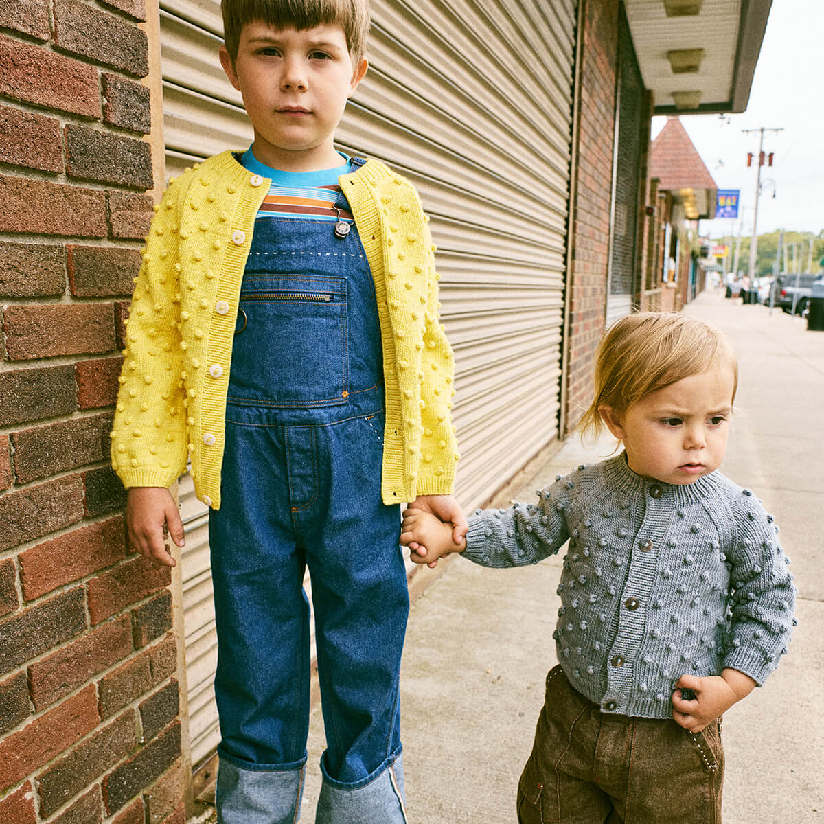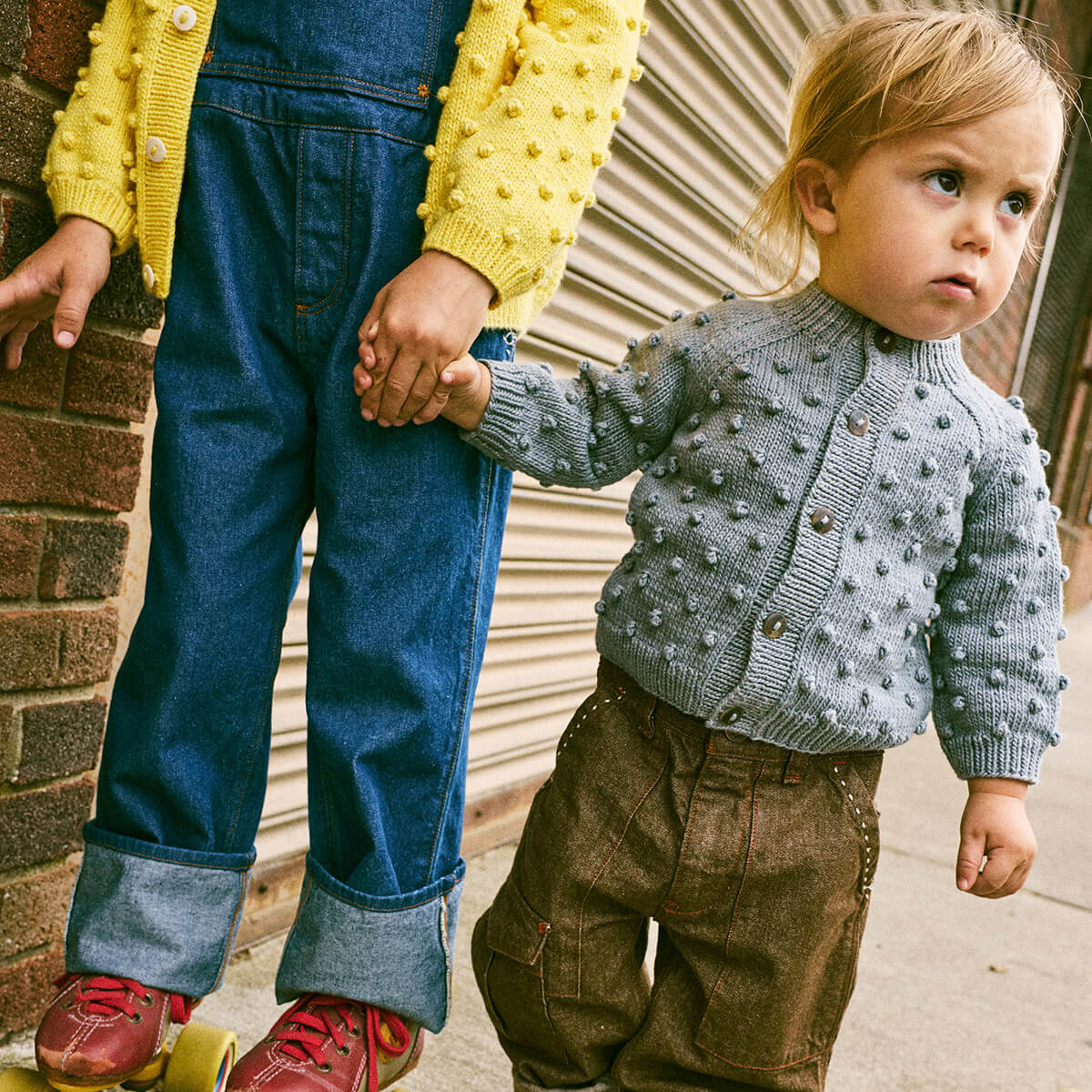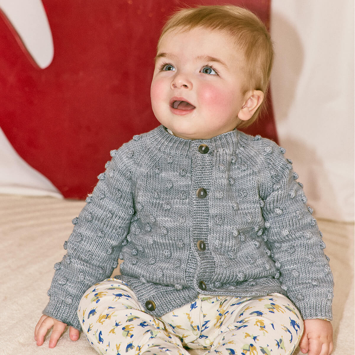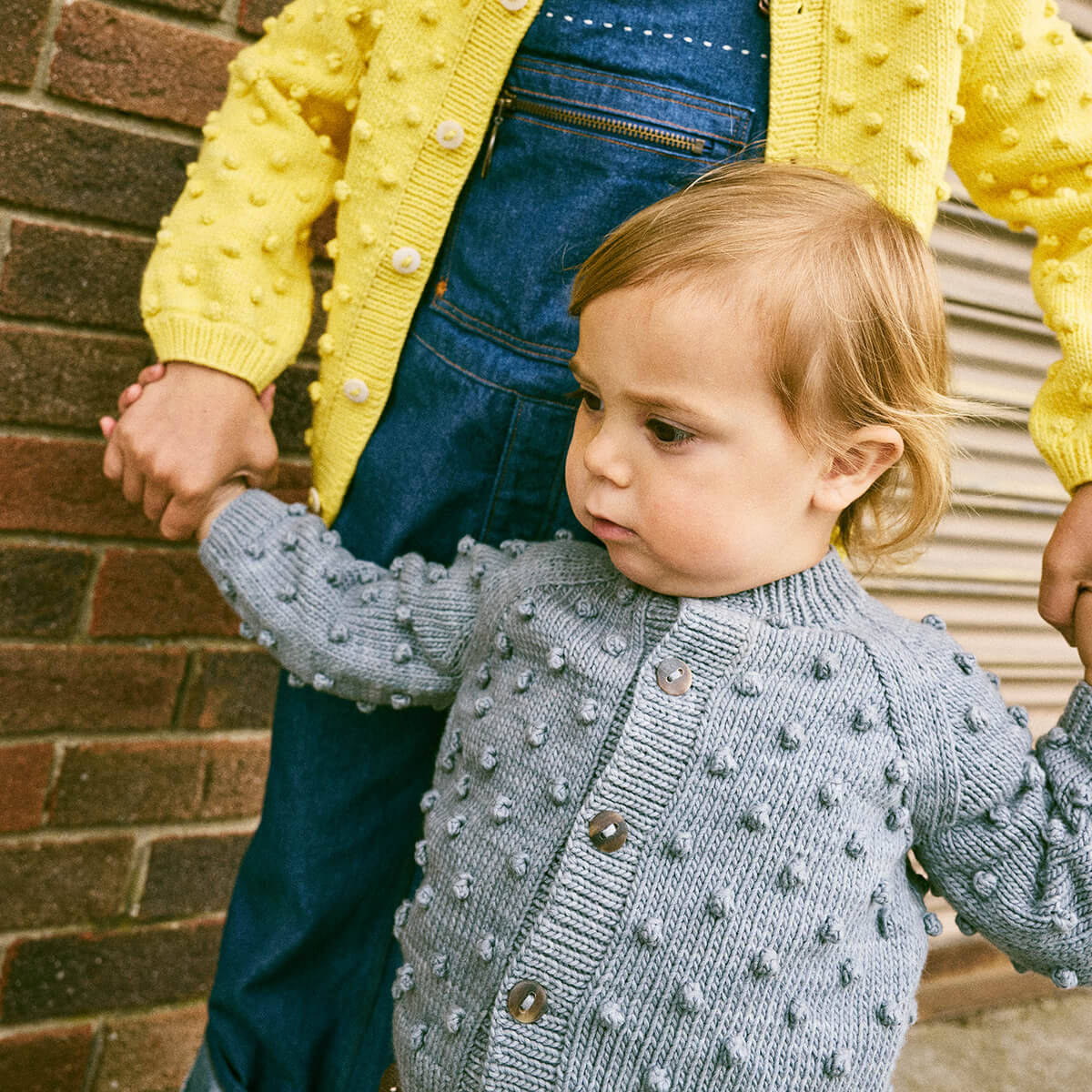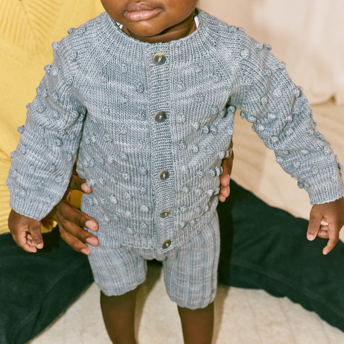 Baby Popcorn Cardigan by Misha & Puff. A roomy hand-knit cardigan in Pima cotton, featuring Misha & Puff's signature all-over popcorn stitch, with a cosy silhouette, ribbed trim and hem, and horn button closure.