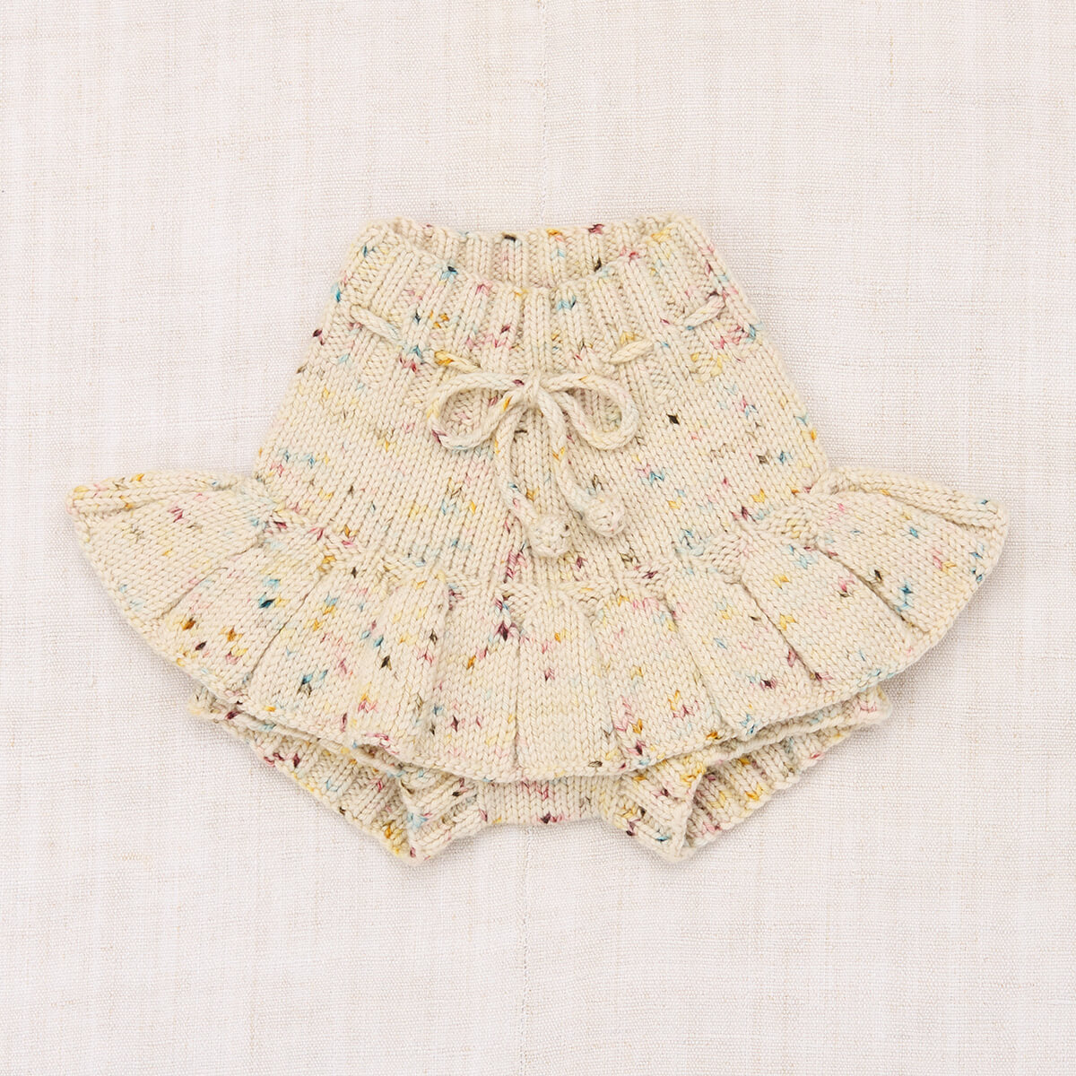 Baby Skating Pond Skirt by Misha & Puff. A hand-knit skirt in Merino wool, featuring attached bloomers with ribbed cuffs and a ribbed waistband with a popcorn-tie drawstring for a secure fit.