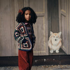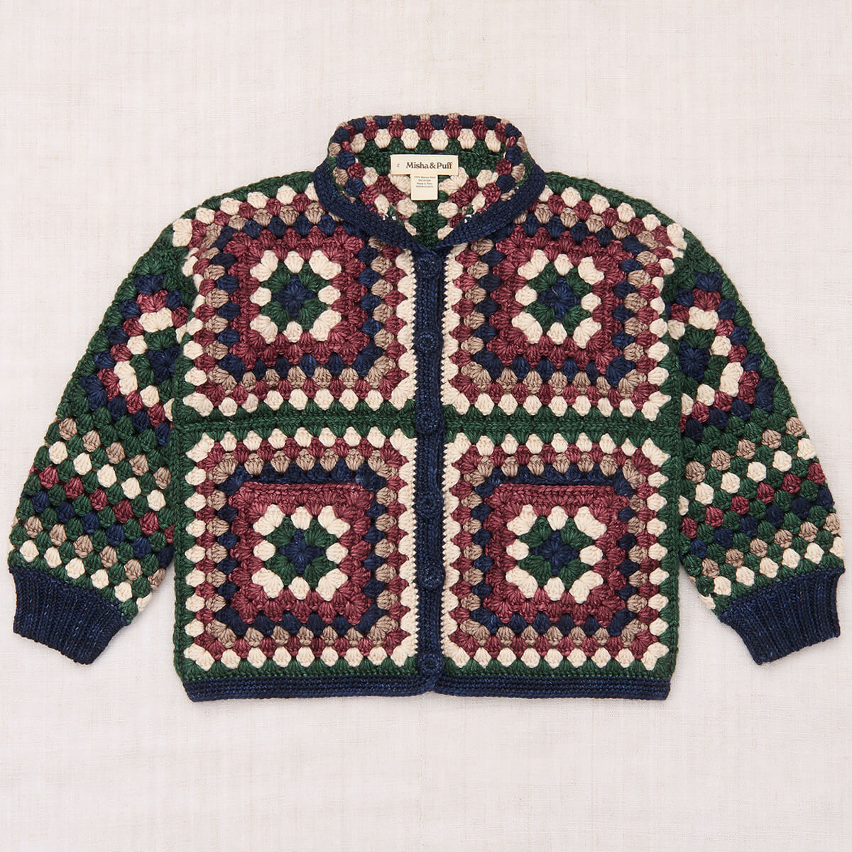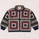 Crochet Big Square Jacket by Misha & Puff. A hand-crocheted jacket sweater in Merino wool, featuring a "granny square" details, a collar, and crochet button closure. A standout style that is both collectible and an easy heirloom piece.