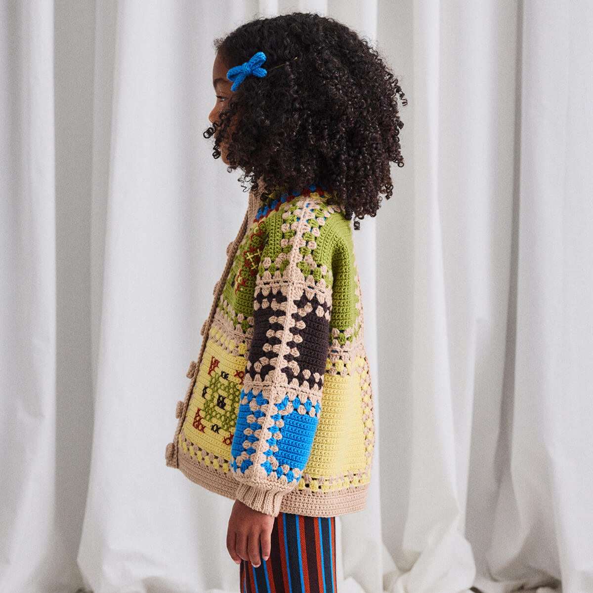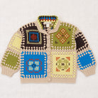 Cross Stich Crochet Cardigan by Misha & Puff. An entirely hand-crocheted jacket in Merino wool, featuring a multicolour collar and crochet button closure. Finished with hand-embroidered cross-stitch designs. A standout style that is both collectible and an easy heirloom piece.
