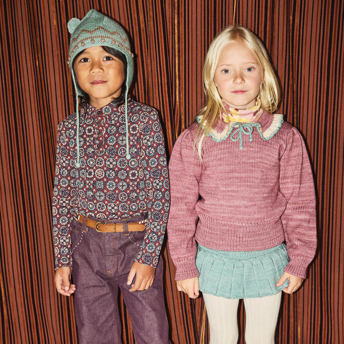 Estelle Sweater by Misha & Puff. A puff-sleeve jumper in Merino wool, featuring a slightly slim, cropped fit, a hand-knit collar with a contrast-striped ruffle edge and popcorn-tie detail, wide ribbed trim, and a horn-button closure at the back neck.