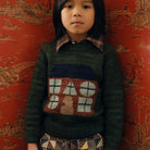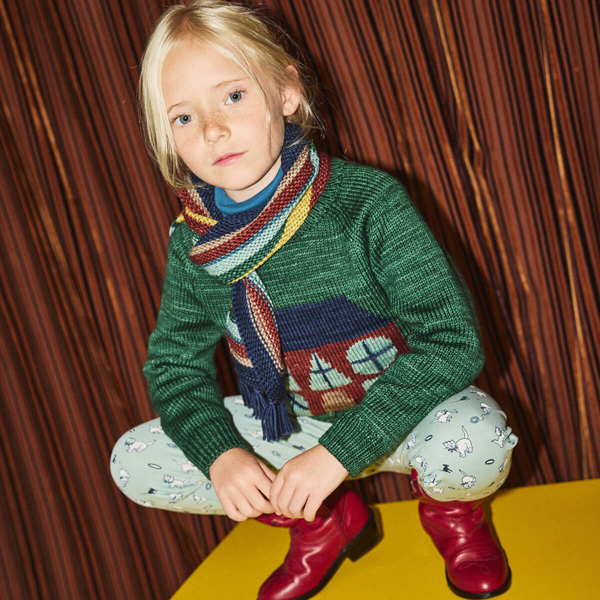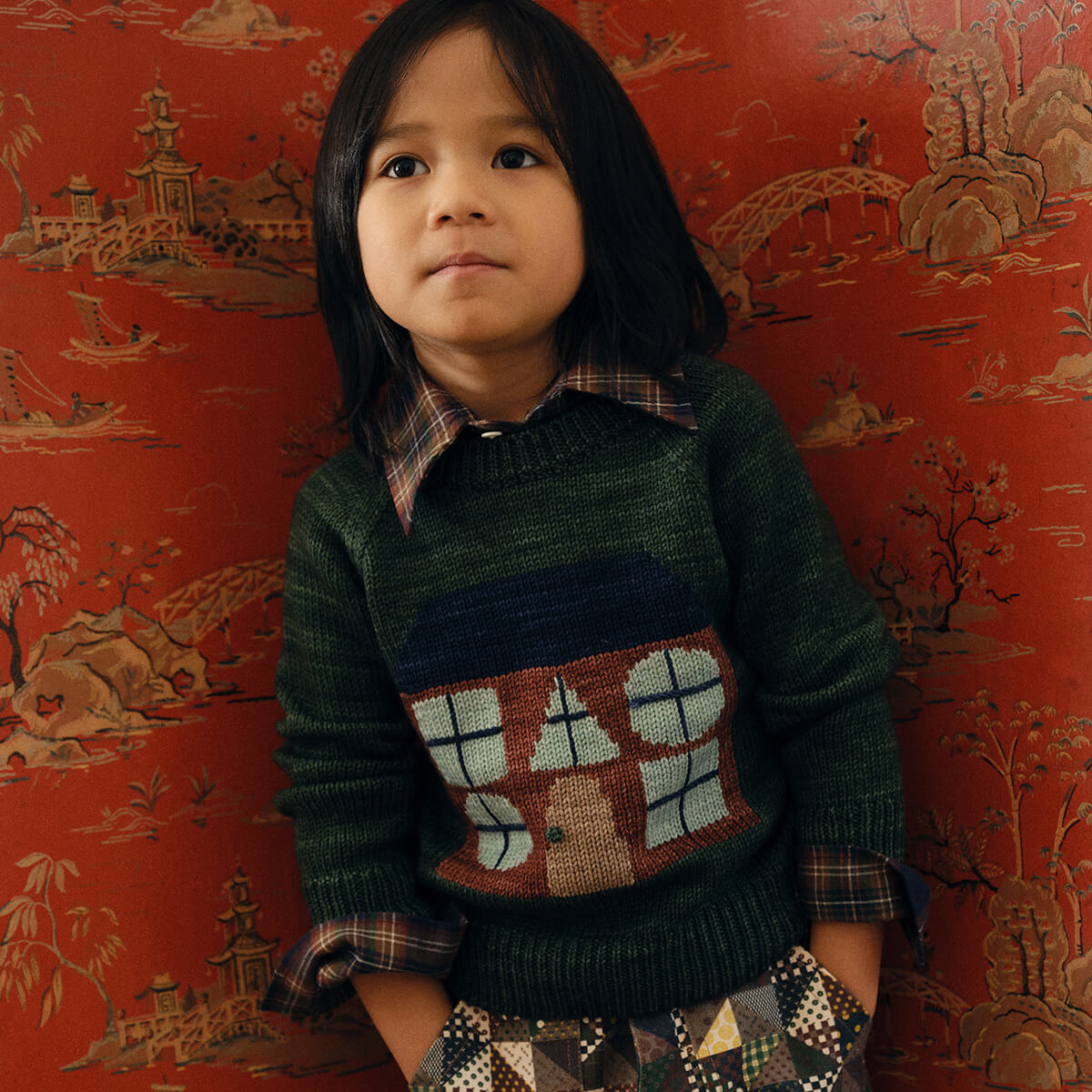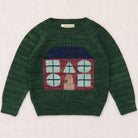 House Sweater by Misha & Puff. A classic crewneck sweater in Merino wool, featuring a slightly roomy shape, and ribbed cuffs and hem. With a special house intarsia by artist Emma Crockatt, and hand-embroidered details with a popcorn doorknob.