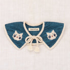 Kitten Collar by Misha & Puff. A hand-knit collar in Merino wool, with soft points with contrast edge, intarsia kitten motif with hand-embroidered detail, and tassel tie closure.