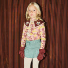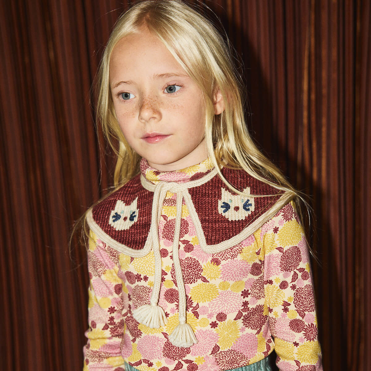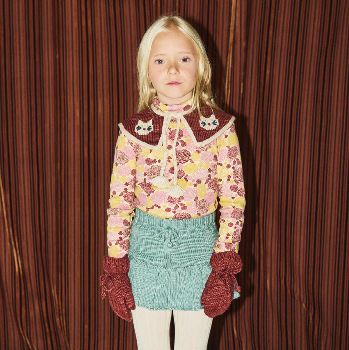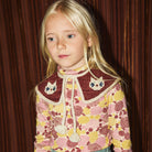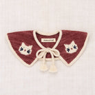 Kitten Collar by Misha & Puff. A hand-knit collar in Merino wool, with soft points with contrast edge, intarsia kitten motif with hand-embroidered detail, and tassel tie closure.