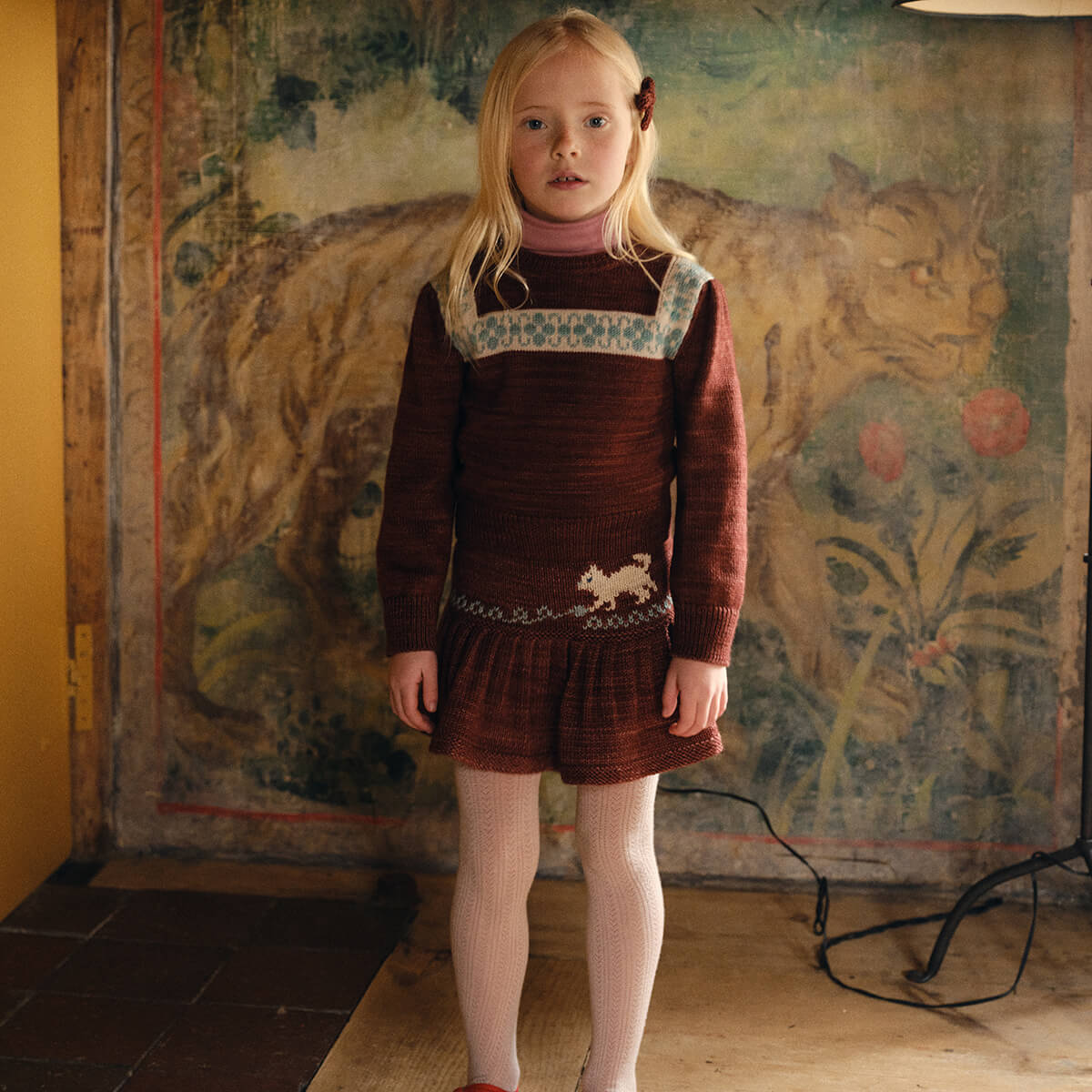 Kitten Tangle Skirt by Misha & Puff. A skirt in Merino wool, featuring a skating silhouette, an intarsia kitten and yarn motif, and soft banded elastic waistband.