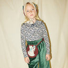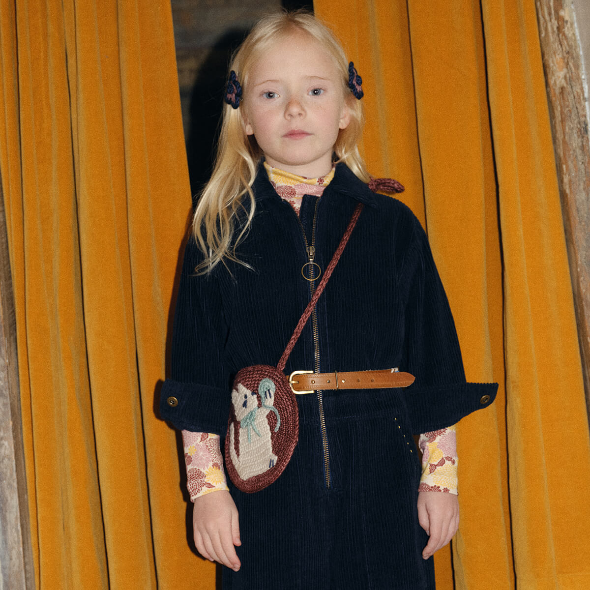 Meadow Yarn Cat Circle Bag by Misha & Puff. A hand-crocheted bag in Merino wool, with an cat motif on one side, double-layered construction for sturdiness, and a magnetic snap closure.