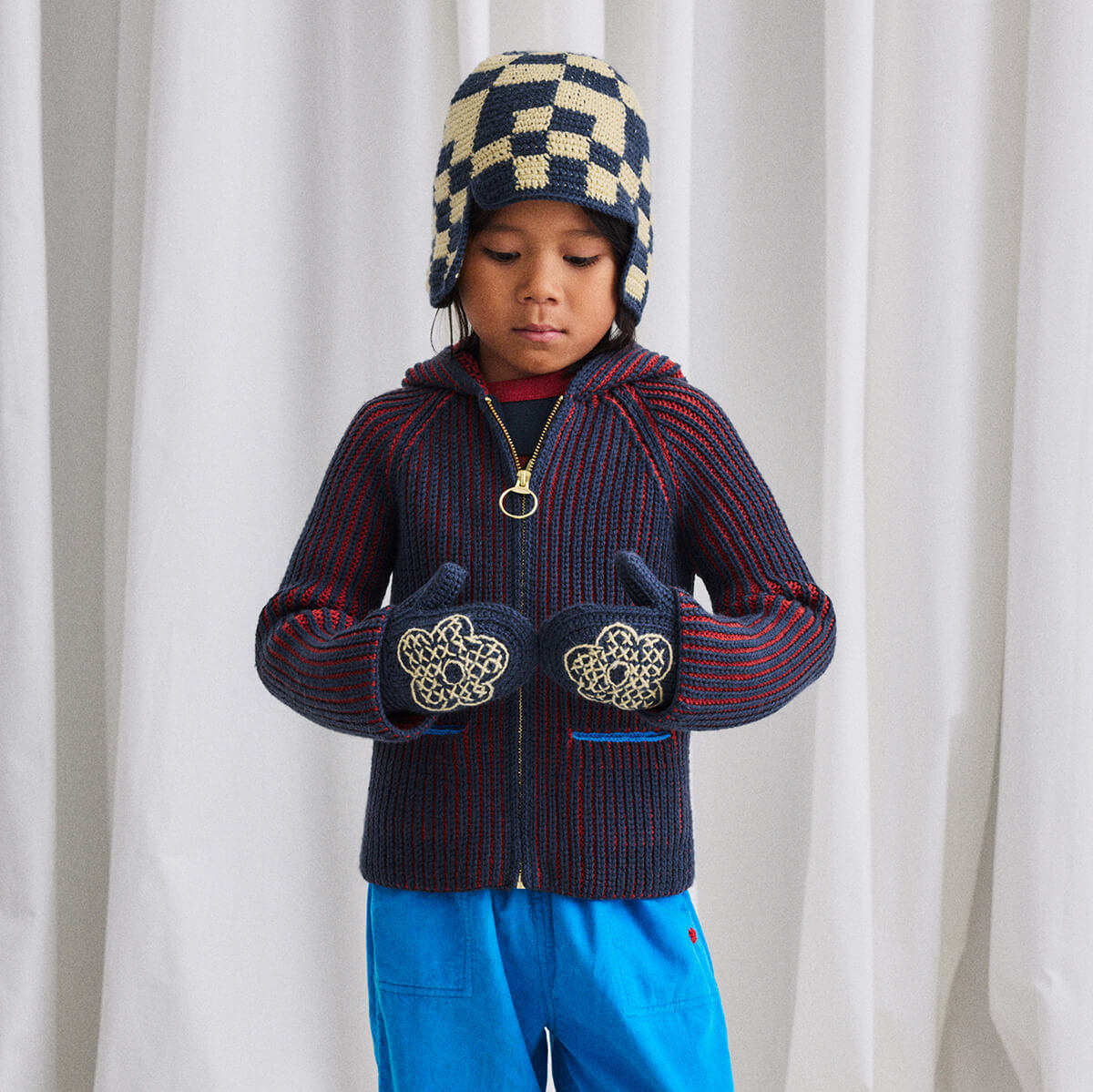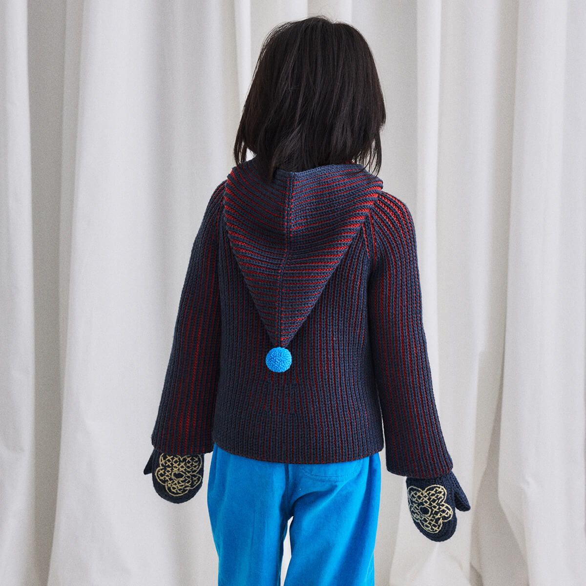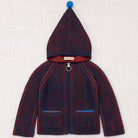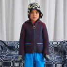 North Wind Jacket by Misha & Puff. A hooded zip-up jacket sweater in Merino wool, featuring a two-tone chunky double brioche rib knit, two front pockets, a playful pom-pom hood, and zip closure.