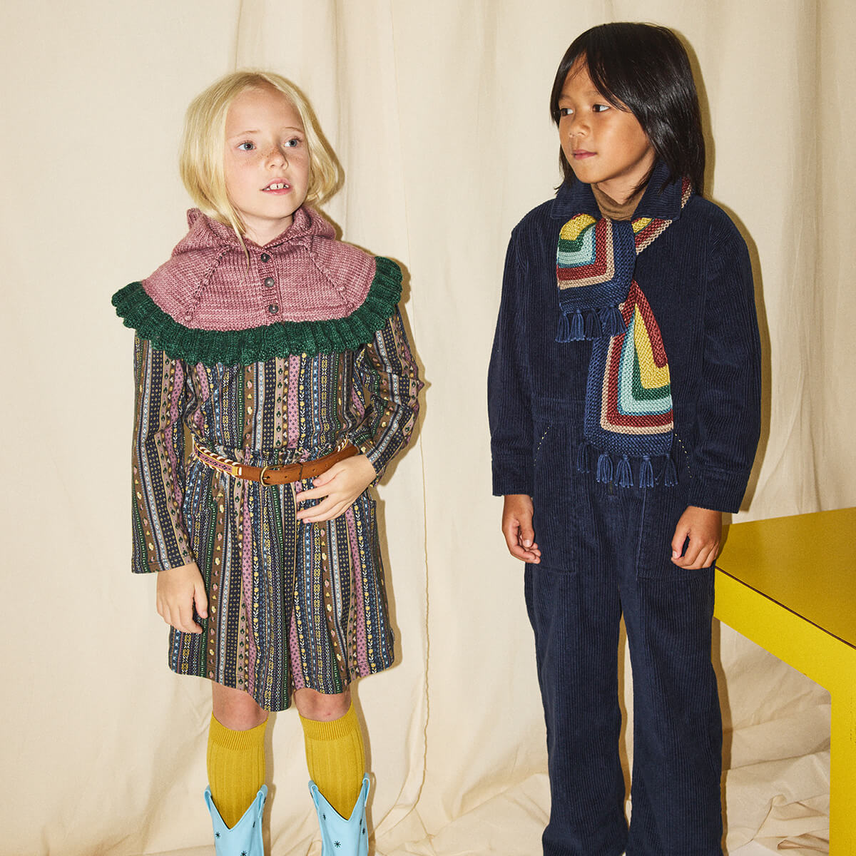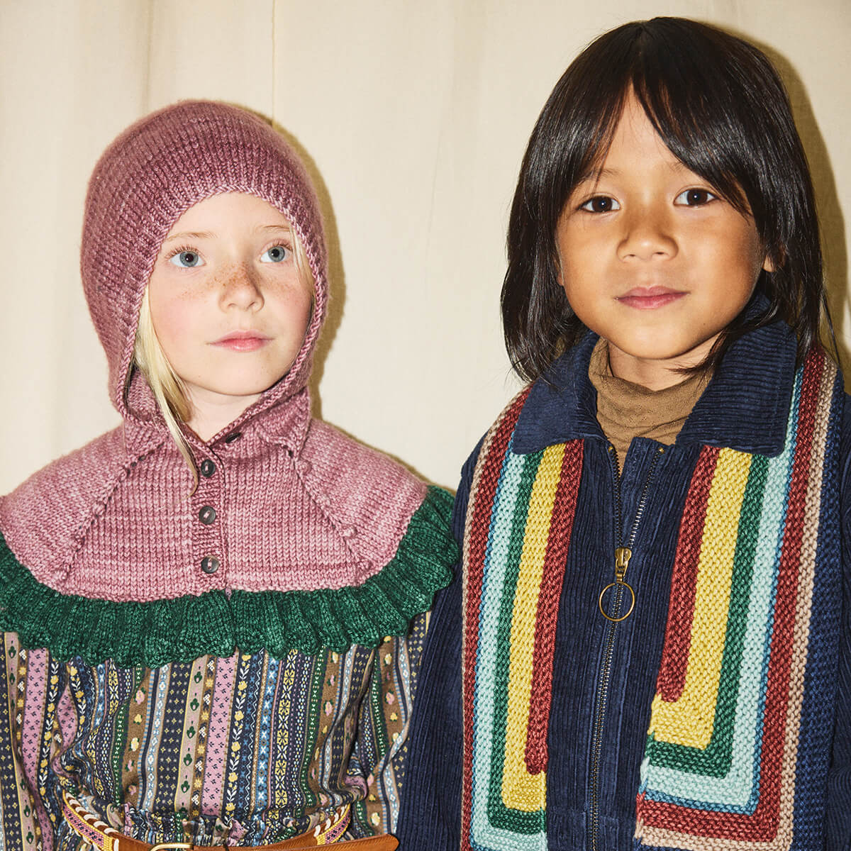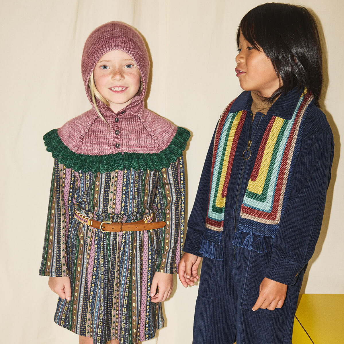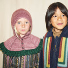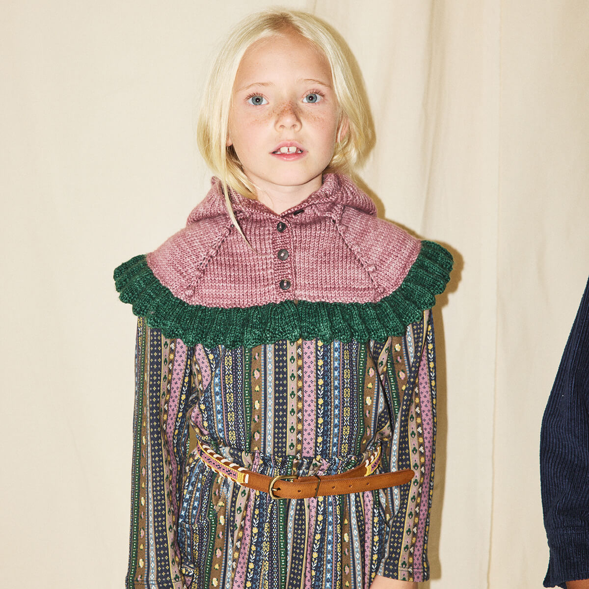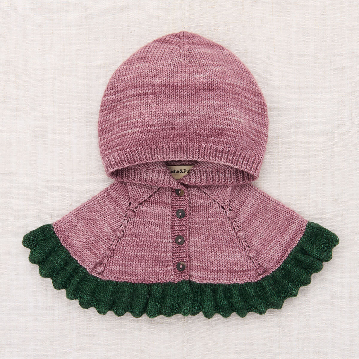 Ruffle Capelet by Misha & Puff. A hand-knit capelet in Merino wool, featuring a bonnet-style hood and a small capelet that drapes down over the shoulders with ruffle trim, eyelet and popcorn stitch detail, and horn button closure up the front.