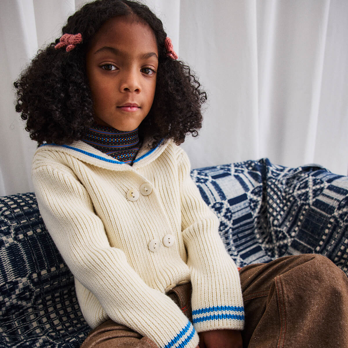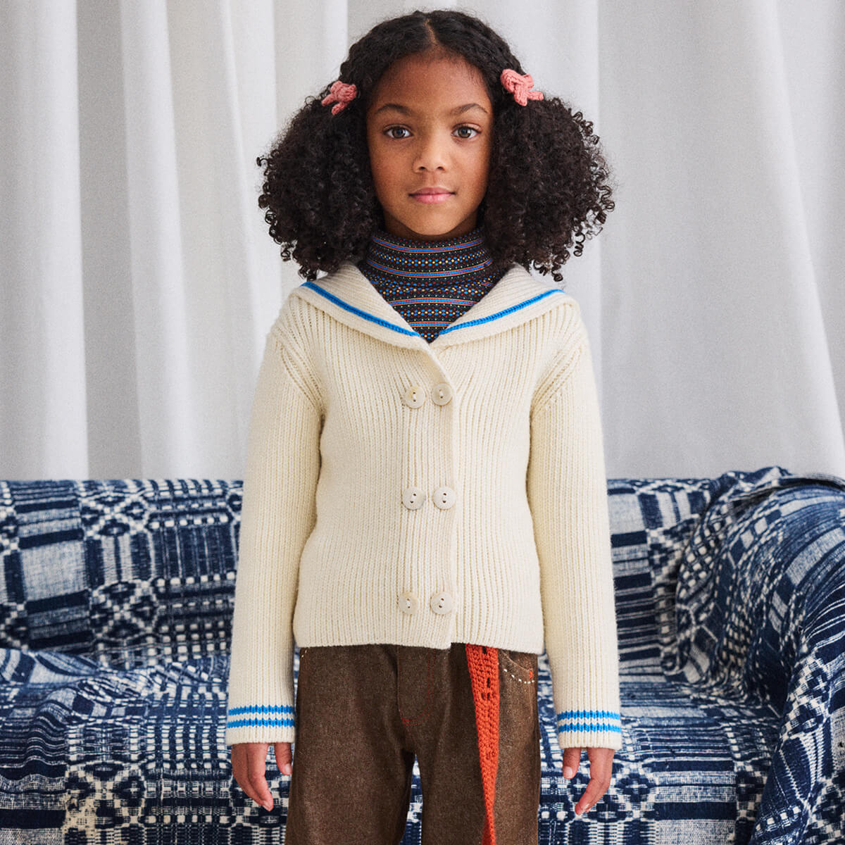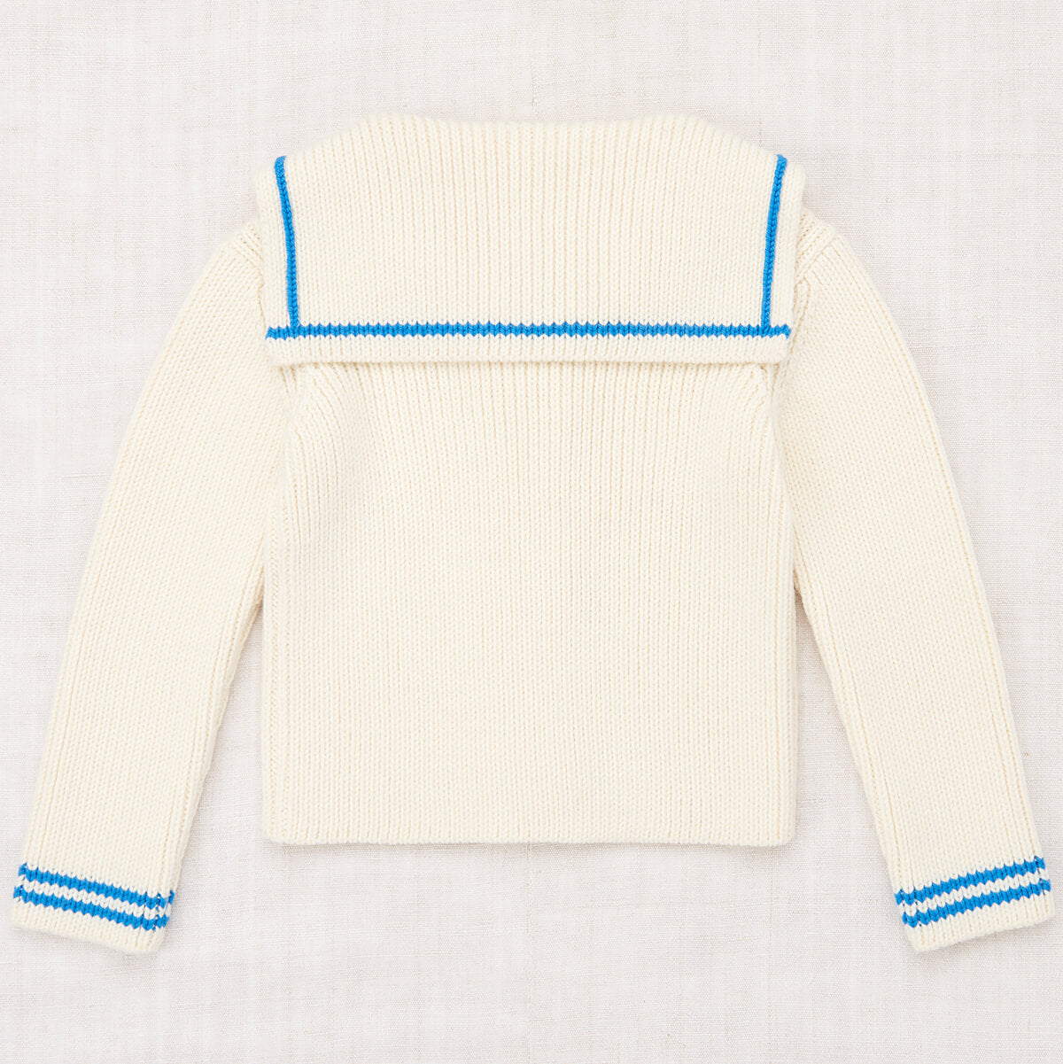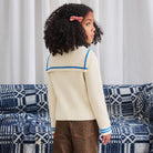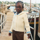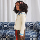 Sailor Rib Cardigan by Misha & Puff. A boxy, vintage-style ribbed cardigan in a Merino wool knit, featuring a sailor collar with contrast stripe trim.