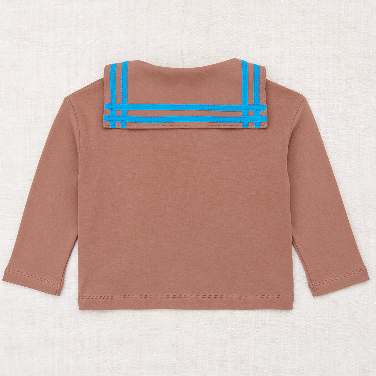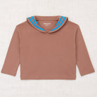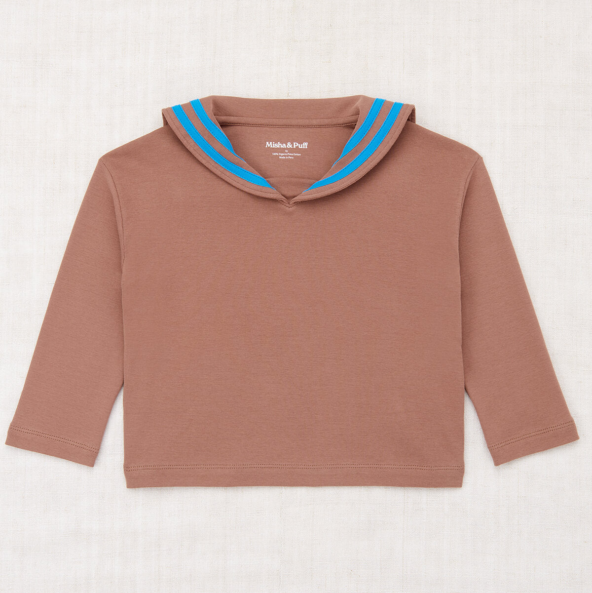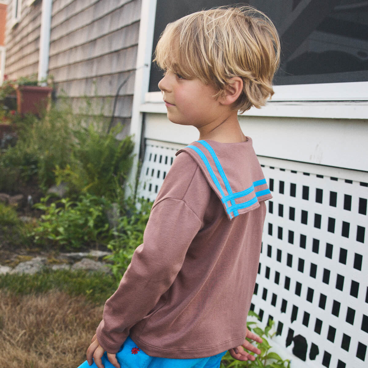 Sailor Top by Misha & Puff.A boxy, vintage-style long-sleeved top in soft Pima cotton, featuring a bateau sailor collar with contrast appliqué striped detailing.
