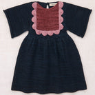 Scallop Bib Dress by Misha & Puff. A dress in a Merino wool knit, featuring a scalloped bib, gathered waist, sleeves with rolled edges, and horn button keyhole closure at the back neck. Sits above the knee on most.