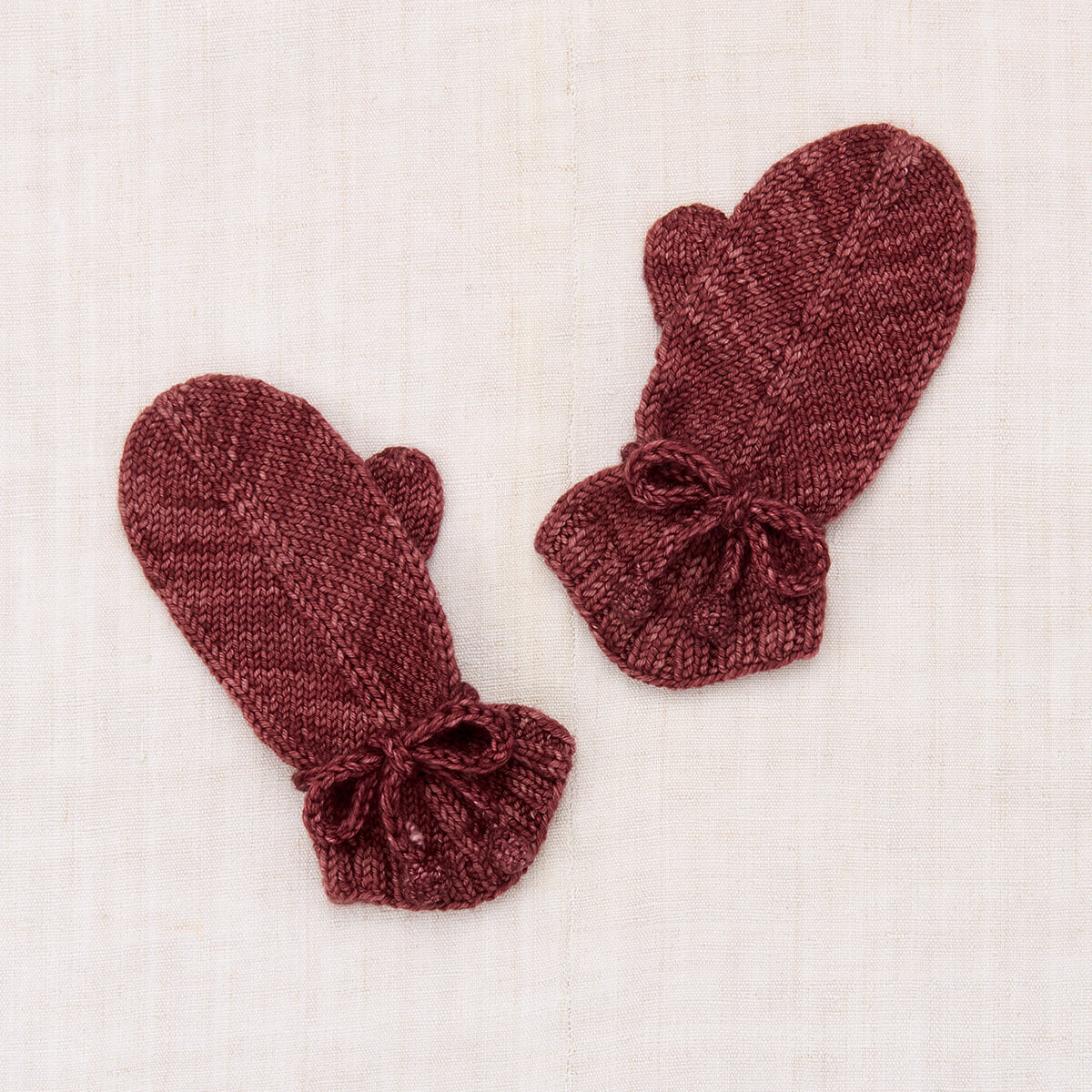 Snowshoe Hare Mittens by Misha & Puff. A hand-knit pair of mittens in Merino wool, featuring a vintage-inspired pointed shape, ribbed trim, and popcorn ties at the wrist to keep out the cold.