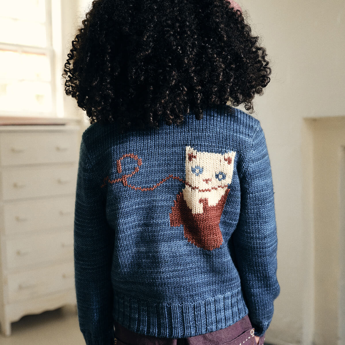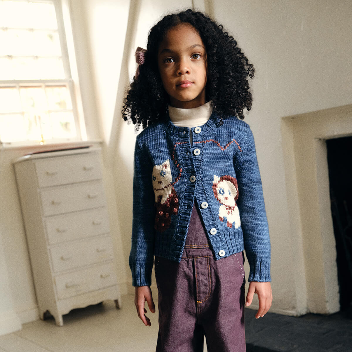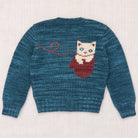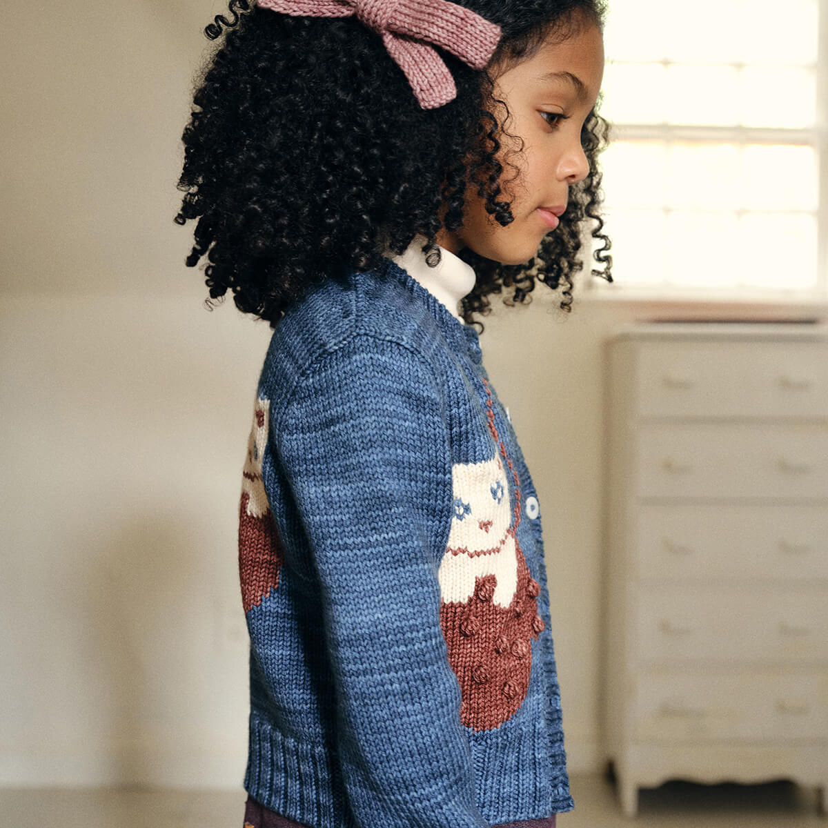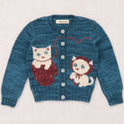 Three Little Kittens Cardigan by Misha & Puff. A classic cardigan in Merino wool, featuring a kitten motif intarsia with hand-worked popcorn stitch detail, ribbed trim, and corozo button closure.