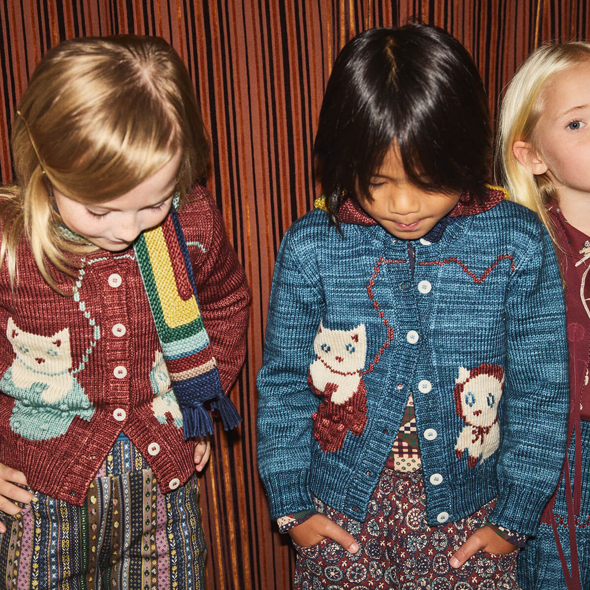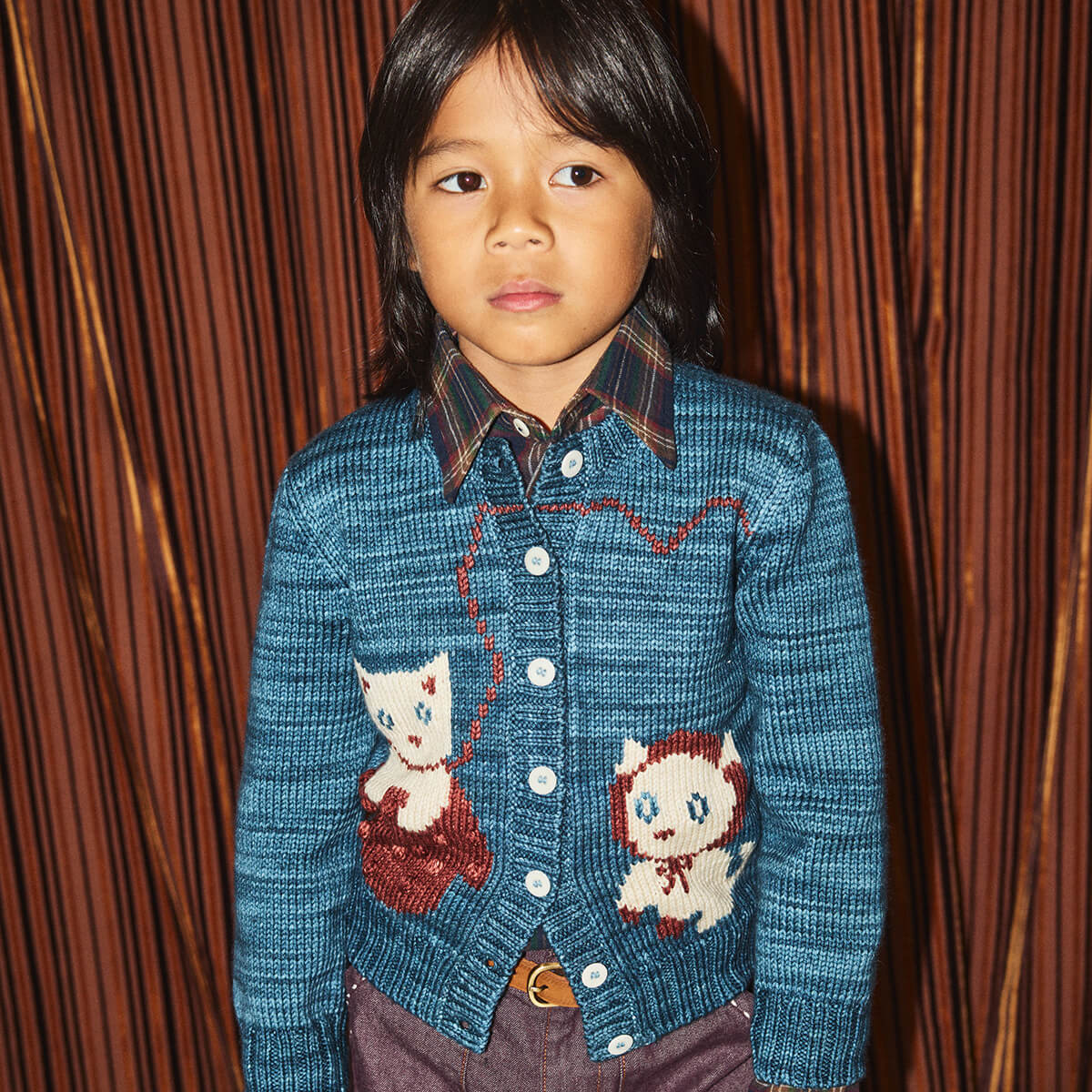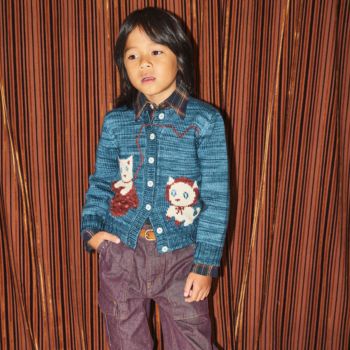 Three Little Kittens Cardigan by Misha & Puff. A classic cardigan in Merino wool, featuring a kitten motif intarsia with hand-worked popcorn stitch detail, ribbed trim, and corozo button closure.