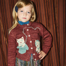 Three Little Kittens Cardigan by Misha & Puff. A classic cardigan in Merino wool, featuring a kitten motif intarsia with hand-worked popcorn stitch detail, ribbed trim, and corozo button closure.