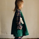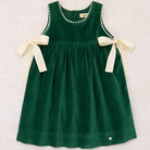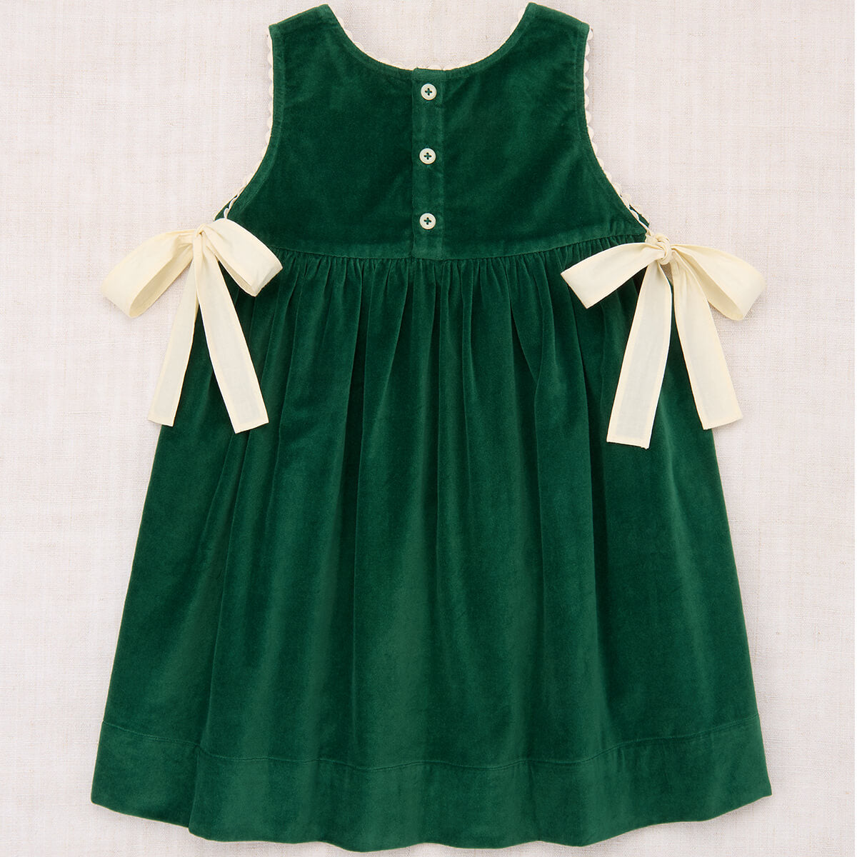 Velvet Esme Dress by Misha & Puff. A dress in soft cotton velvet, featuring inset rickrack trim along the neck and arms, two bows with side-arm closures, corozo button closure down the back, and a small hand-embroidered Misha & Puff star motif.