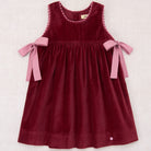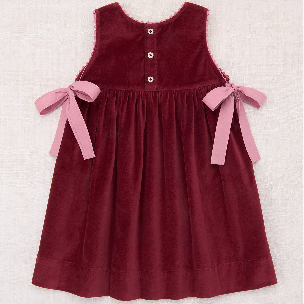 Velvet Esme Dress by Misha & Puff. A dress in soft cotton velvet, featuring inset rickrack trim along the neck and arms, two bows with side-arm closures, corozo button closure down the back, and a small hand-embroidered Misha & Puff star motif.