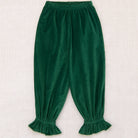 Velvet Zuzu Pant by Misha & Puff. A statement-making pull-on pant in cotton velvet, featuring a gathered elastic waistband and a ruffled hem with embroidered dot-stitch detailing, adding a touch of flair.