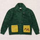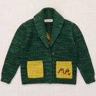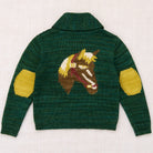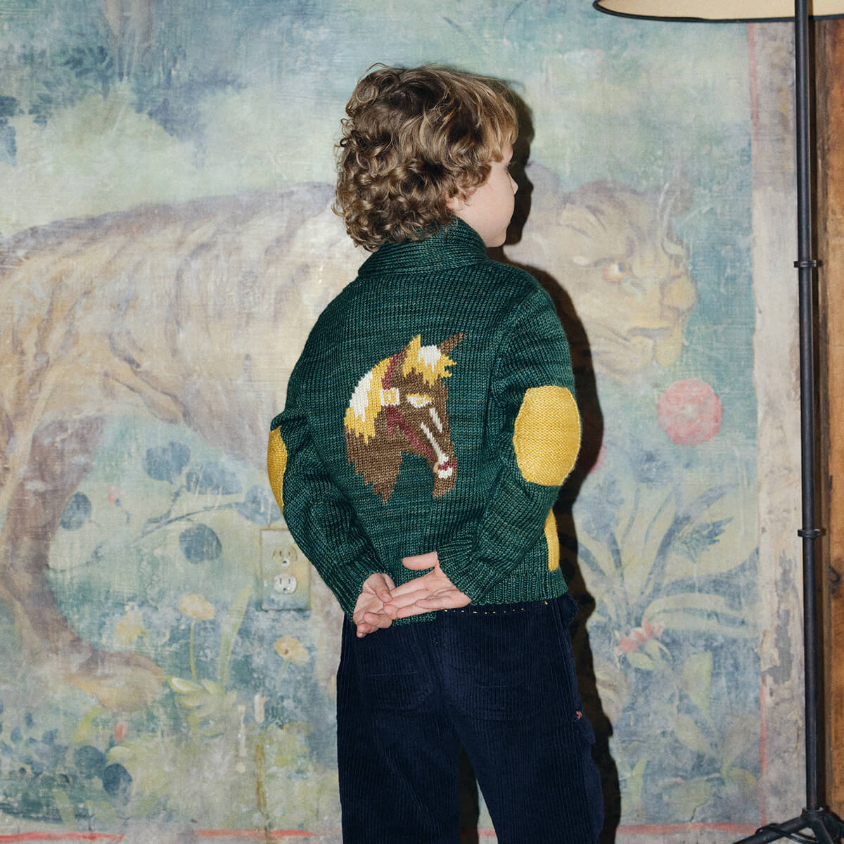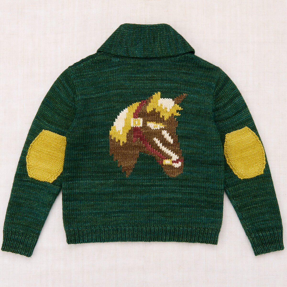 Yearling Shawl Collar Cardigan by Misha & Puff. A cardigan in Merino wool, featuring a shawl collar, special horse intarsia on the back, patch pockets with hand-embroidered Misha & Puff detail, elbow patches, ribbed trim, and a horn button closure.