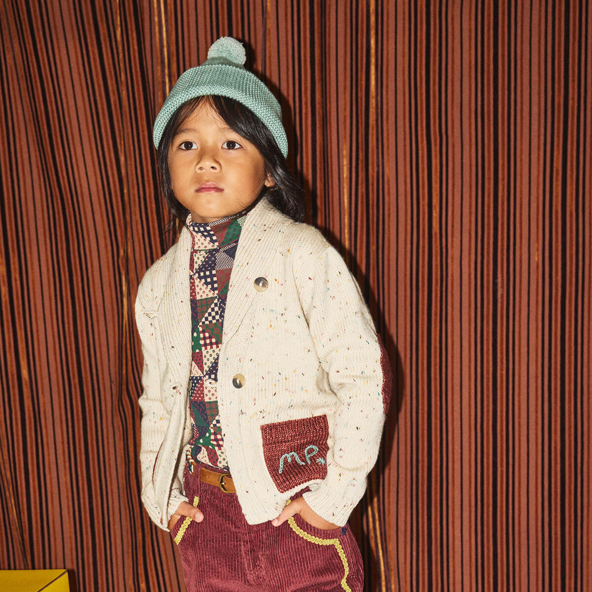 Yearling Shawl Collar Cardigan by Misha & Puff. A cardigan in Merino wool, featuring a shawl collar, special horse intarsia on the back, patch pockets with hand-embroidered Misha & Puff detail, elbow patches, ribbed trim, and a horn button closure.