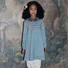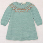Zig Zag Dress by Misha & Puff. A long-sleeved dress in Merino wool, featuring an A-line silhouette, hand-worked popcorn stitch detail, a zig zag motif, open neckline, and a horn button keyhole closure at the back neck.