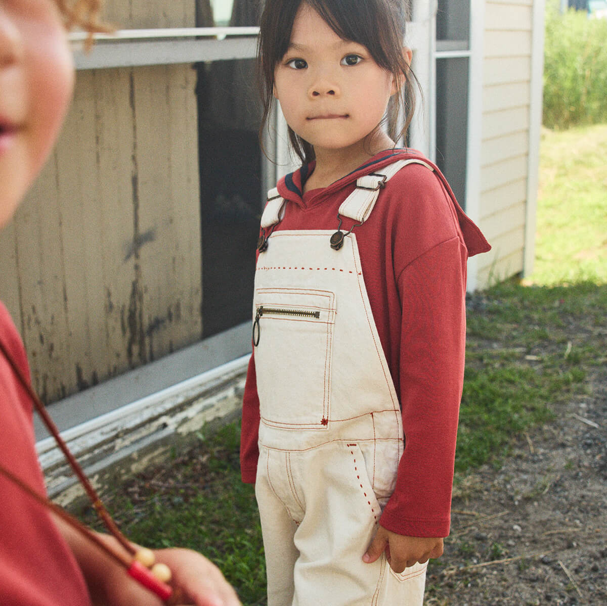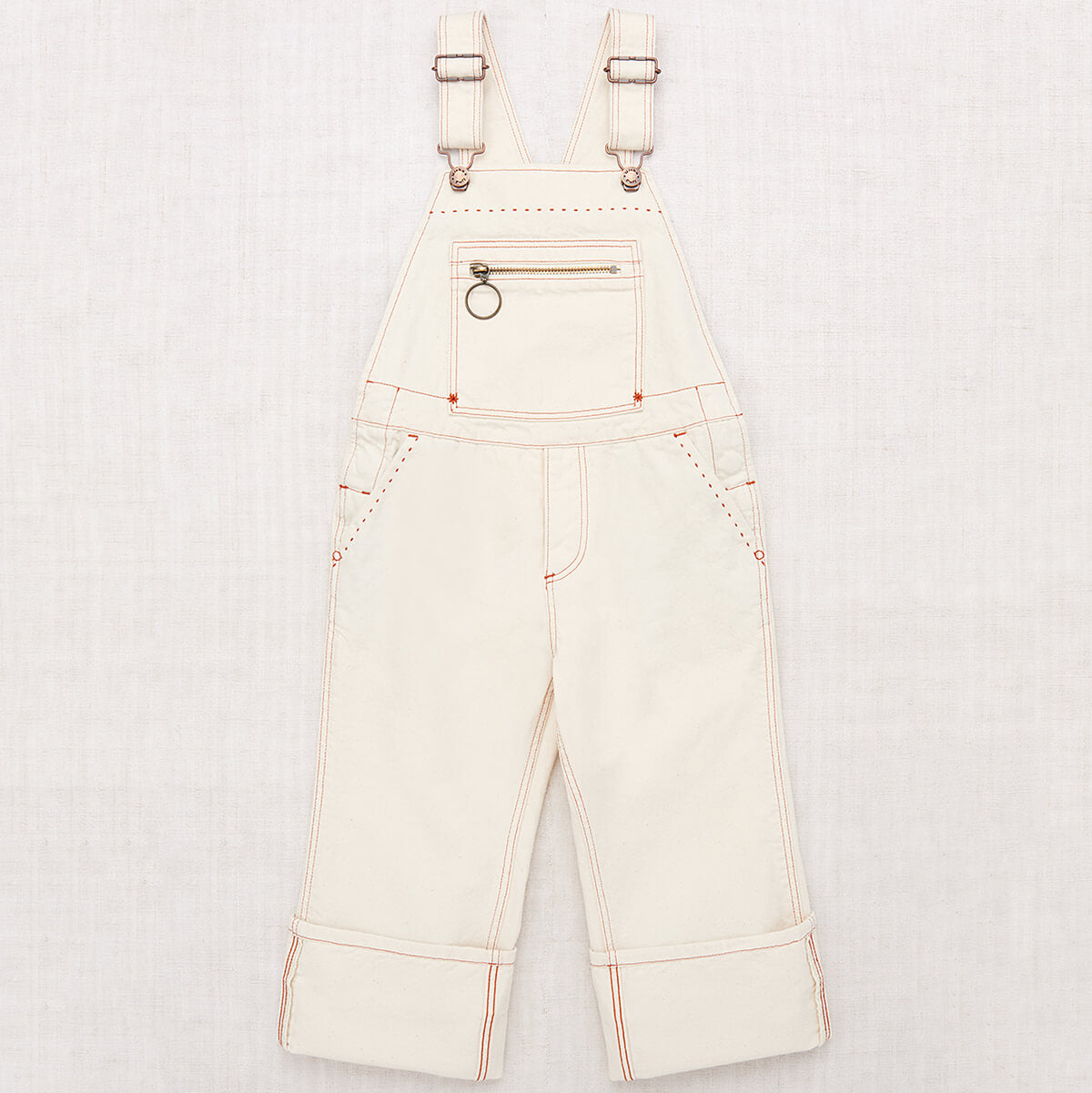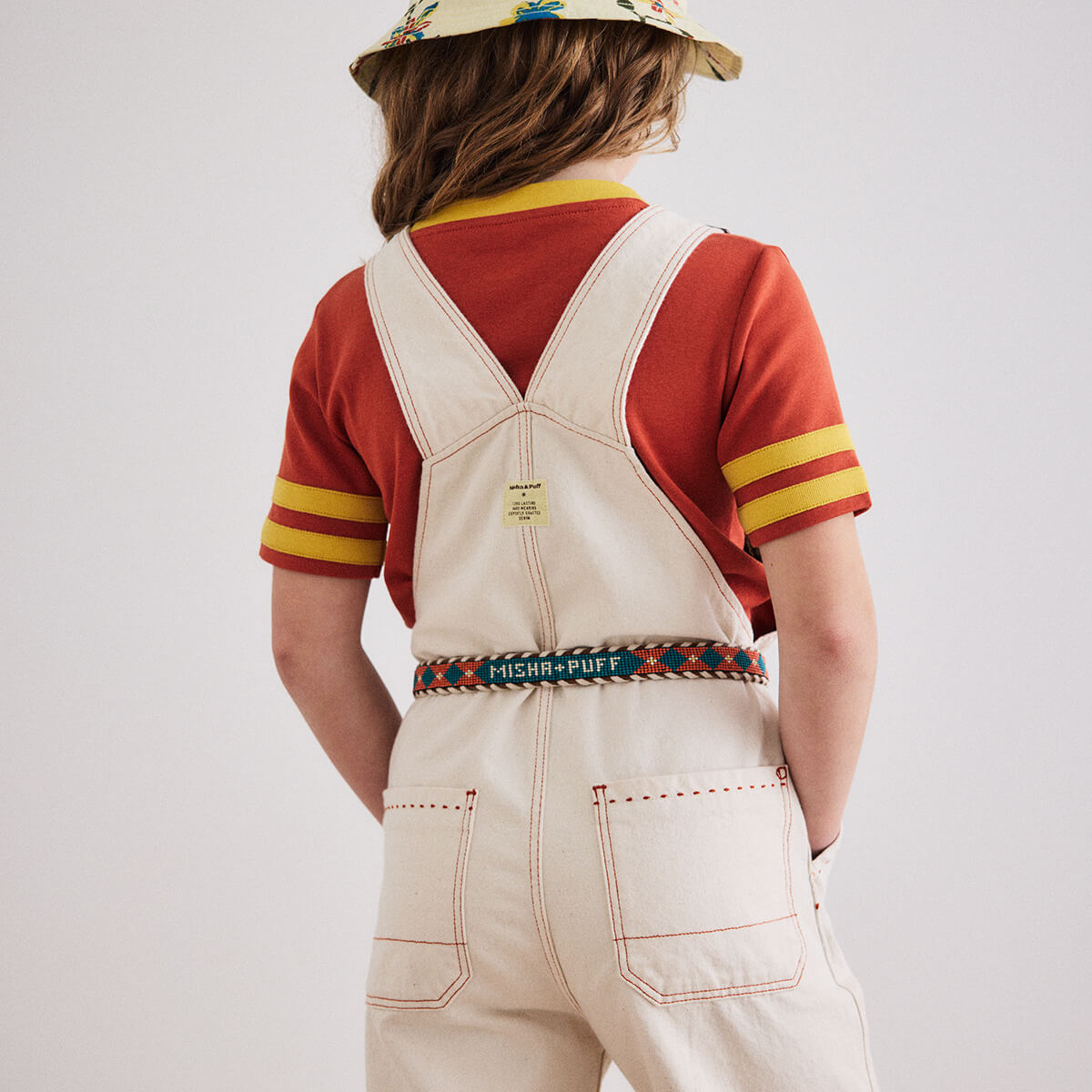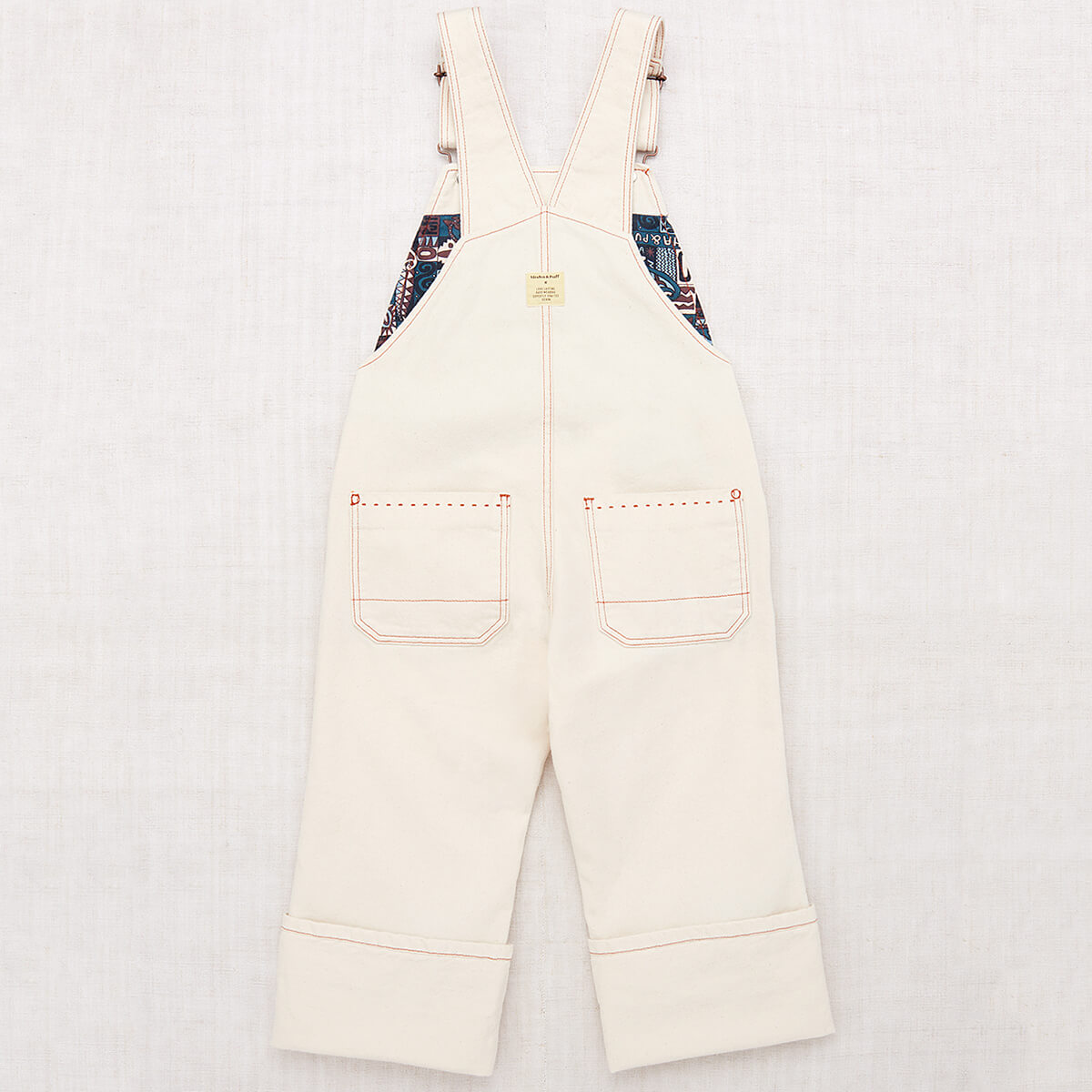 Zip Overall by Misha & Puff. A vintage-inspired overall in 100% cotton denim, with adjustable straps, front-zip bib pocket, two front contrast print lined pockets, two back patch pockets, a rolled cuff that can be unrolled, and allover contrast topstitch detail. Finished with hand-tacked stitches instead of rivets for softness.