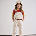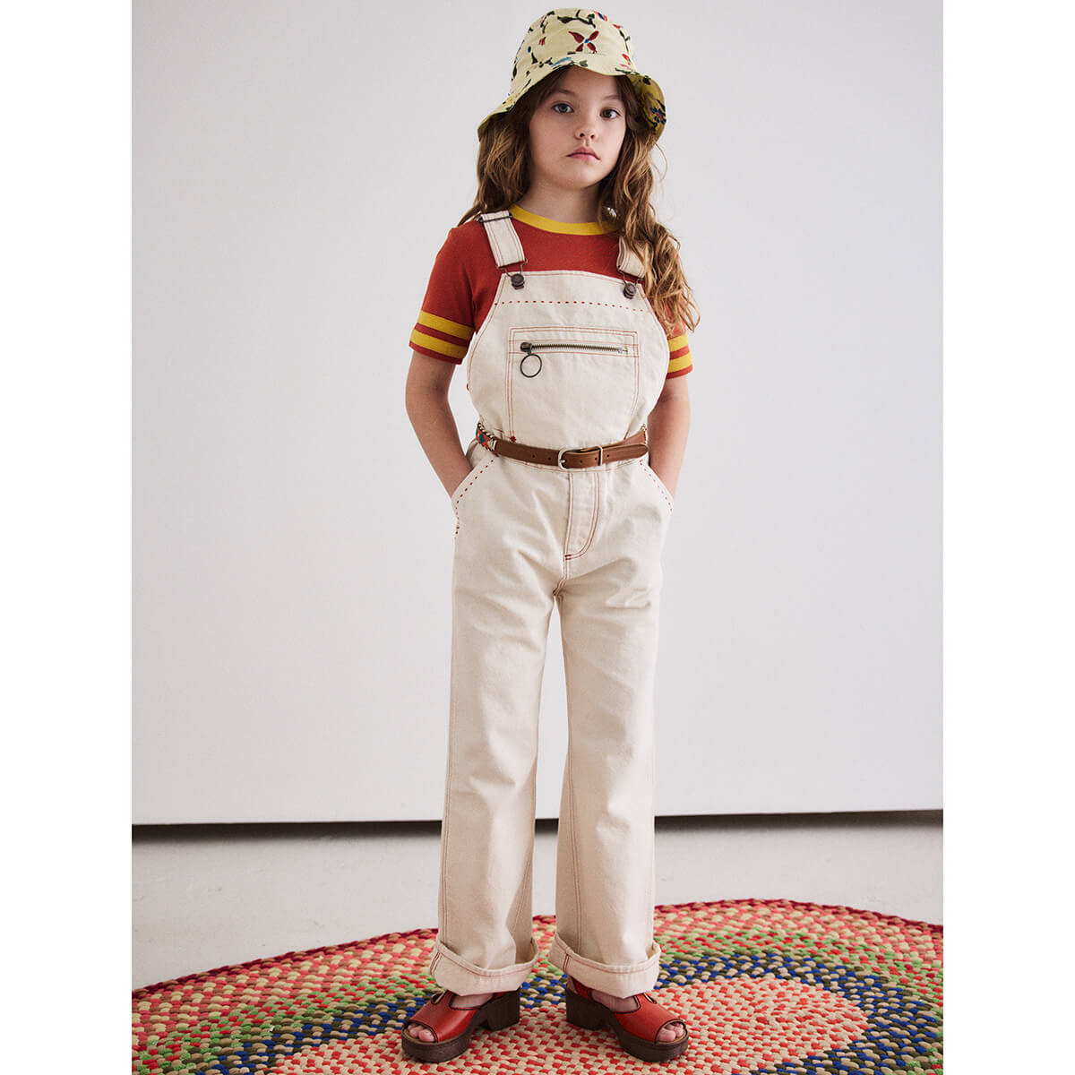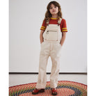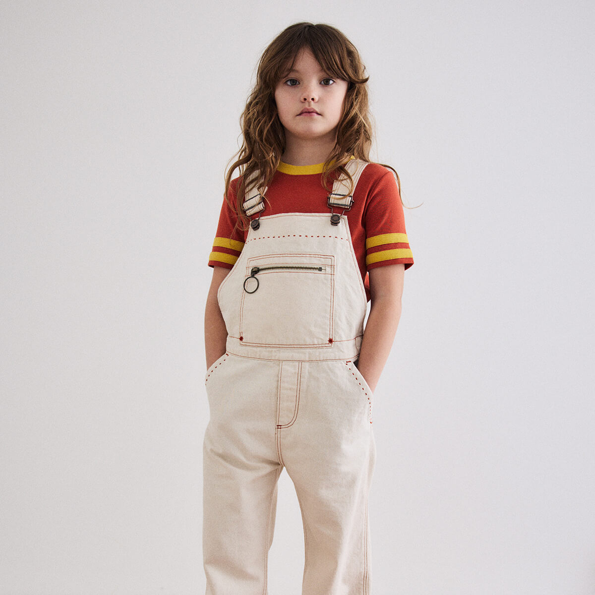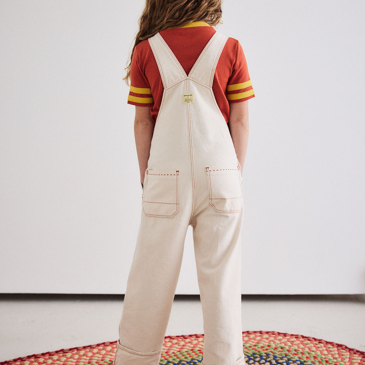 Zip Overall by Misha & Puff. A vintage-inspired overall in 100% cotton denim, with adjustable straps, front-zip bib pocket, two front contrast print lined pockets, two back patch pockets, a rolled cuff that can be unrolled, and allover contrast topstitch detail. Finished with hand-tacked stitches instead of rivets for softness.