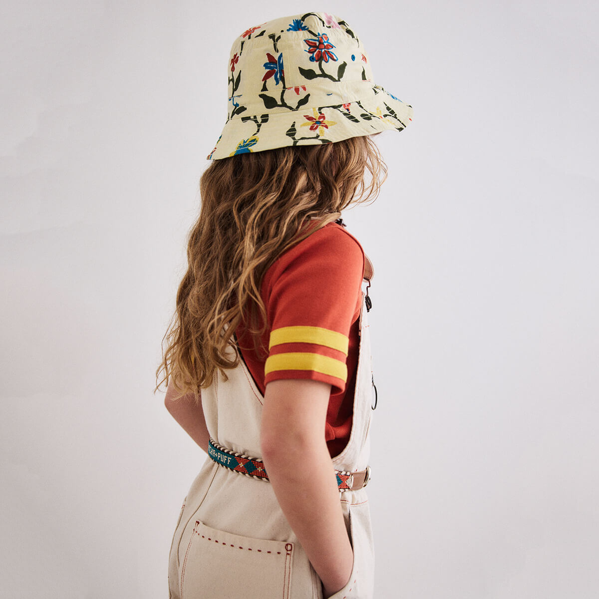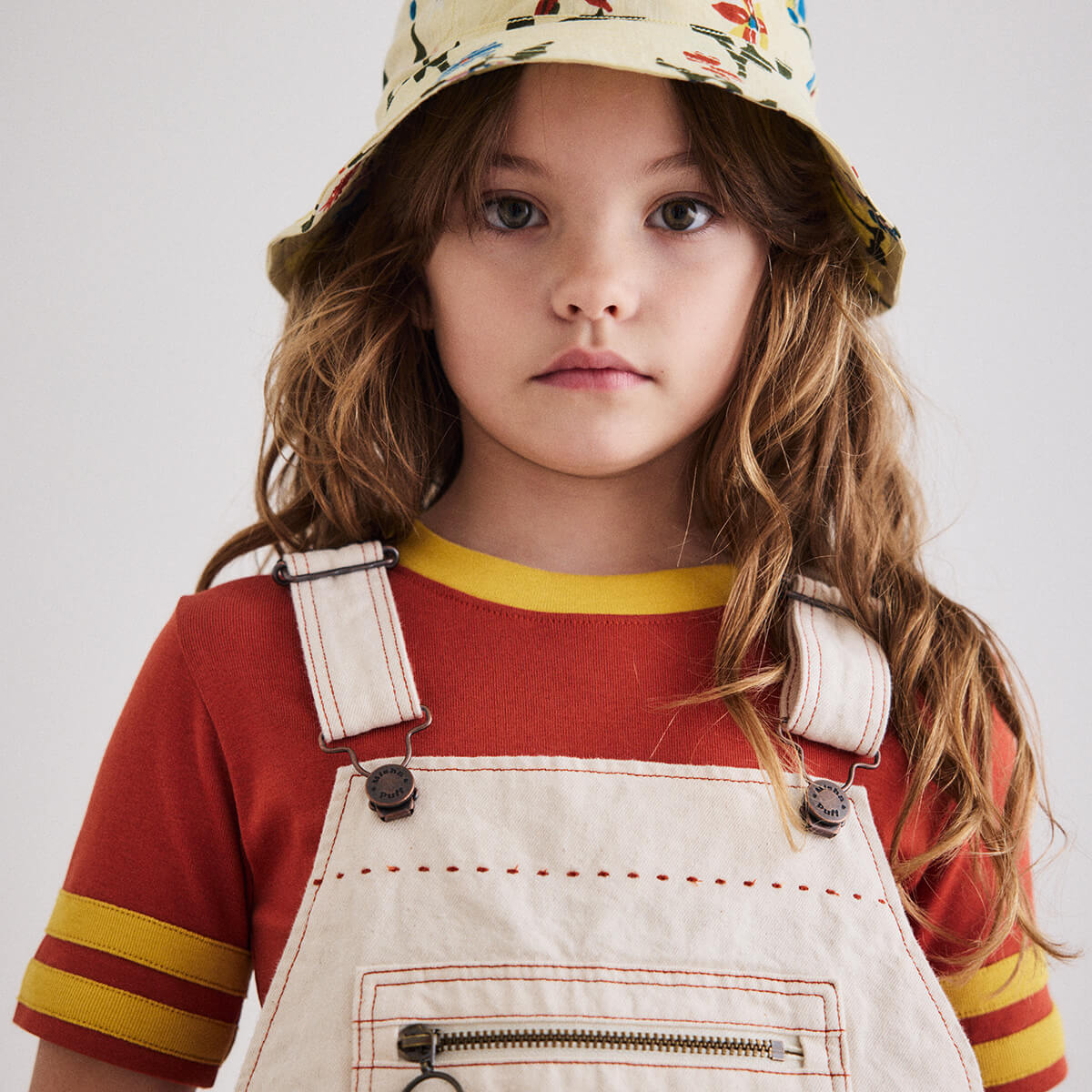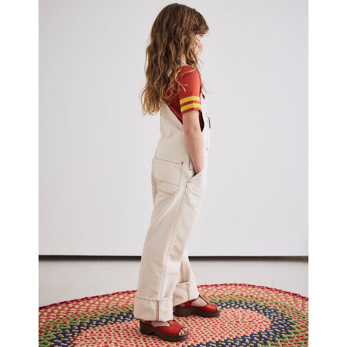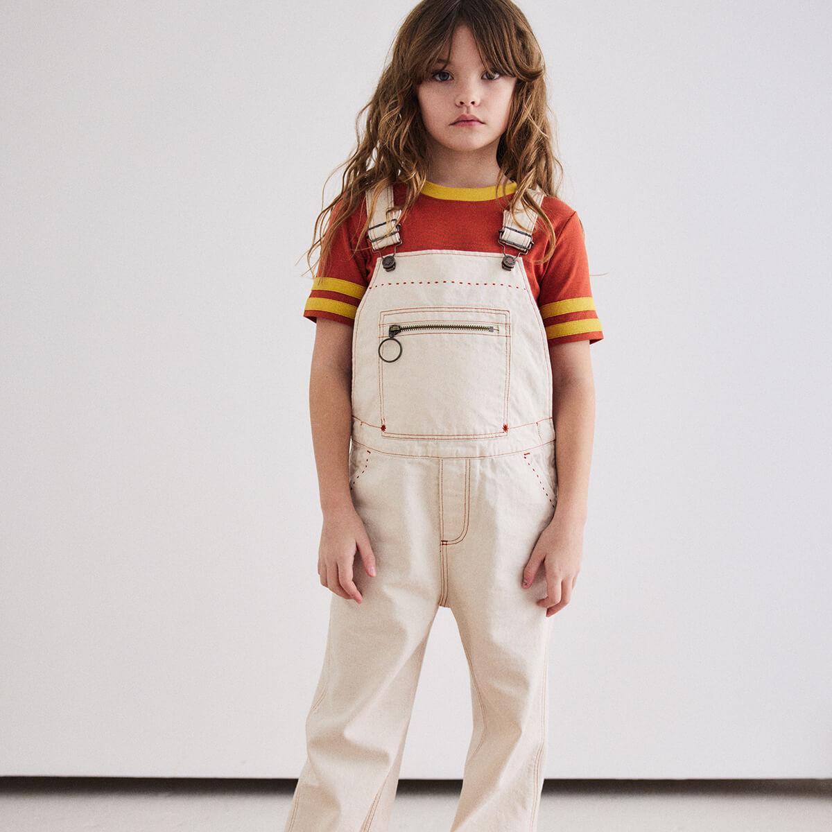 Zip Overall by Misha & Puff. A vintage-inspired overall in 100% cotton denim, with adjustable straps, front-zip bib pocket, two front contrast print lined pockets, two back patch pockets, a rolled cuff that can be unrolled, and allover contrast topstitch detail. Finished with hand-tacked stitches instead of rivets for softness.