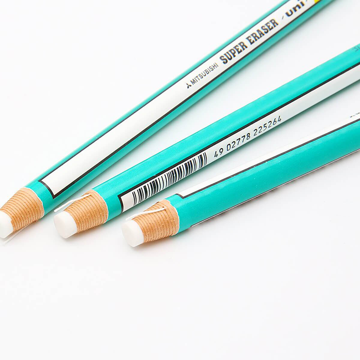 Uni Pencil Eraser by Mitsubishi. Mitsubishi Uni Pencil Eraser - an eraser in pencil form. This chunky Japanese eraser is perfect for precision erasing. Simply peel back the paper as required using the little string to reveal more of the rubber when you need it. This eraser is medium hardness and is perfect for correcting HB-6B graphite.