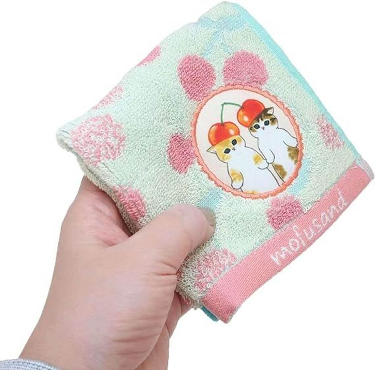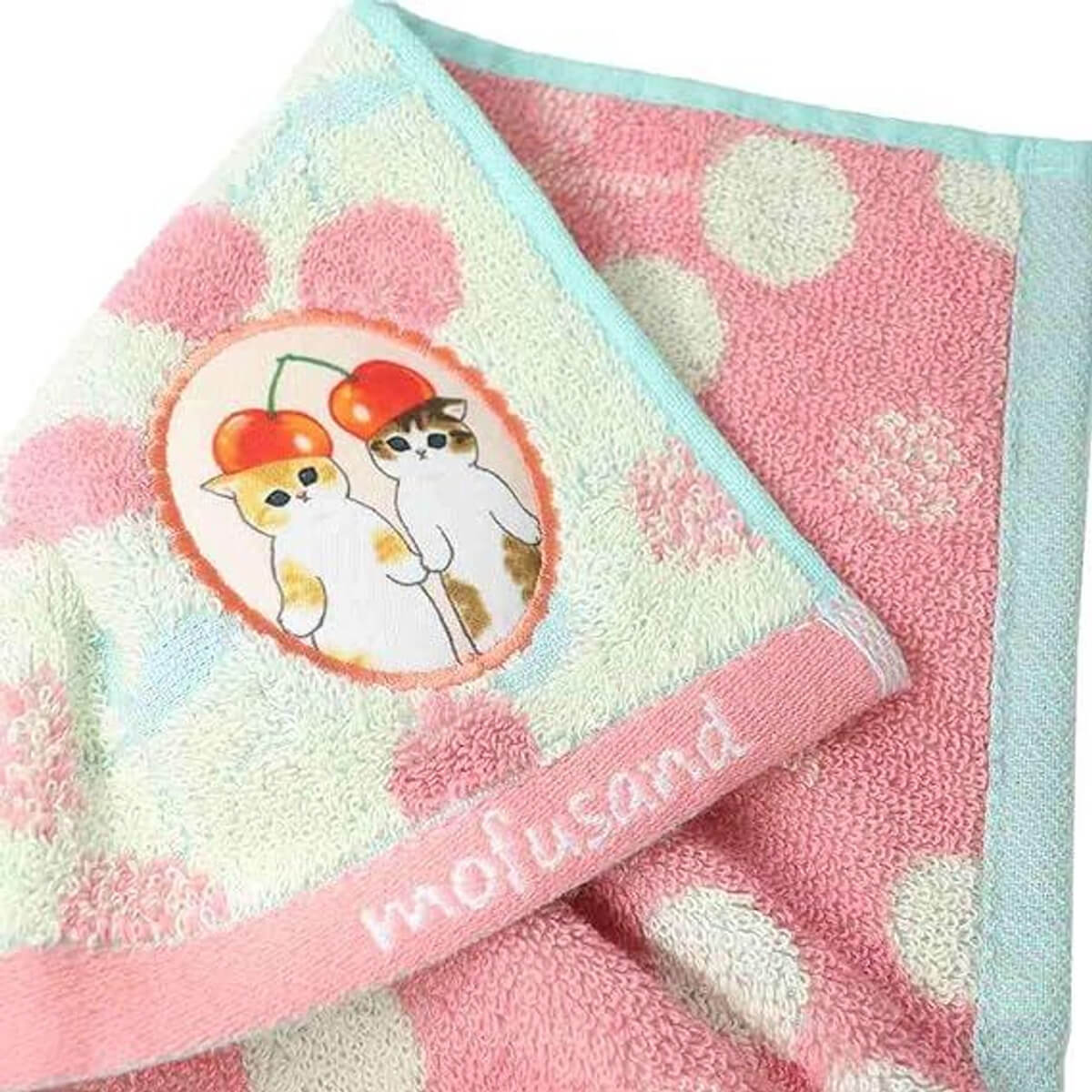Sakuranbo Nyan Mofusand Mini Hand Towel (25cm) by Marushin Japan. A small and soft washcloth-sized pile jacquard towel with applique embroidery and a woven name tag. The towel has additionally been treated with a special antibacterial and deodorising process to prevent unpleasant odours and suppress the growth of bacteria on the fibres. Safe for children to use.