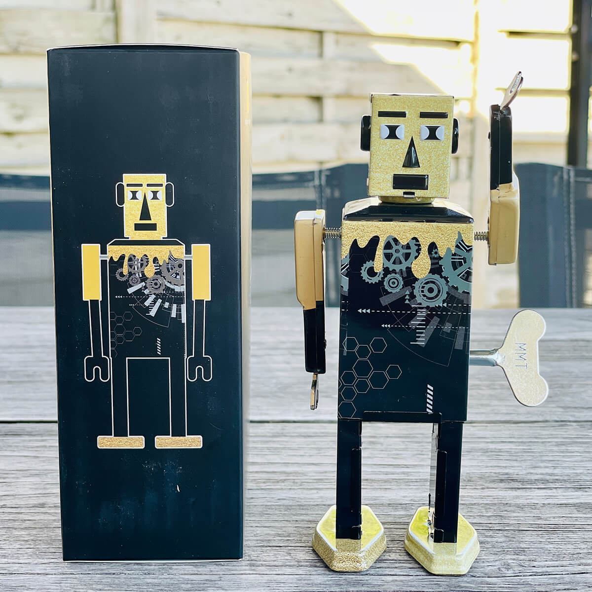 Goldhead Bot limited edition wind up tin robot by Mr & Mrs Tin. Wind them up and watch them go!