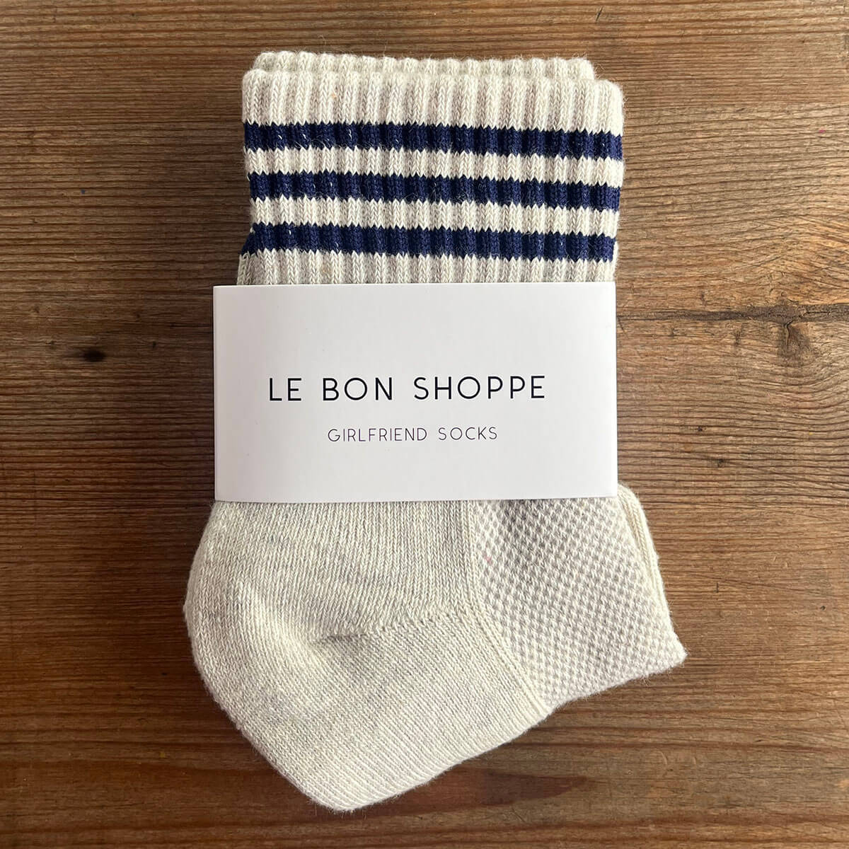 Girlfriend socks by Le Bon Shoppe. The cool, quarter-crew version of the signature Boyfriend Socks. The Girlfriend Socks feature a contrast triple stripe, mesh along the top of the foot for breathability, and elastic arch support. They’re a universally quintessential sock and especially flattering for our petite ladies, great for every day wear.