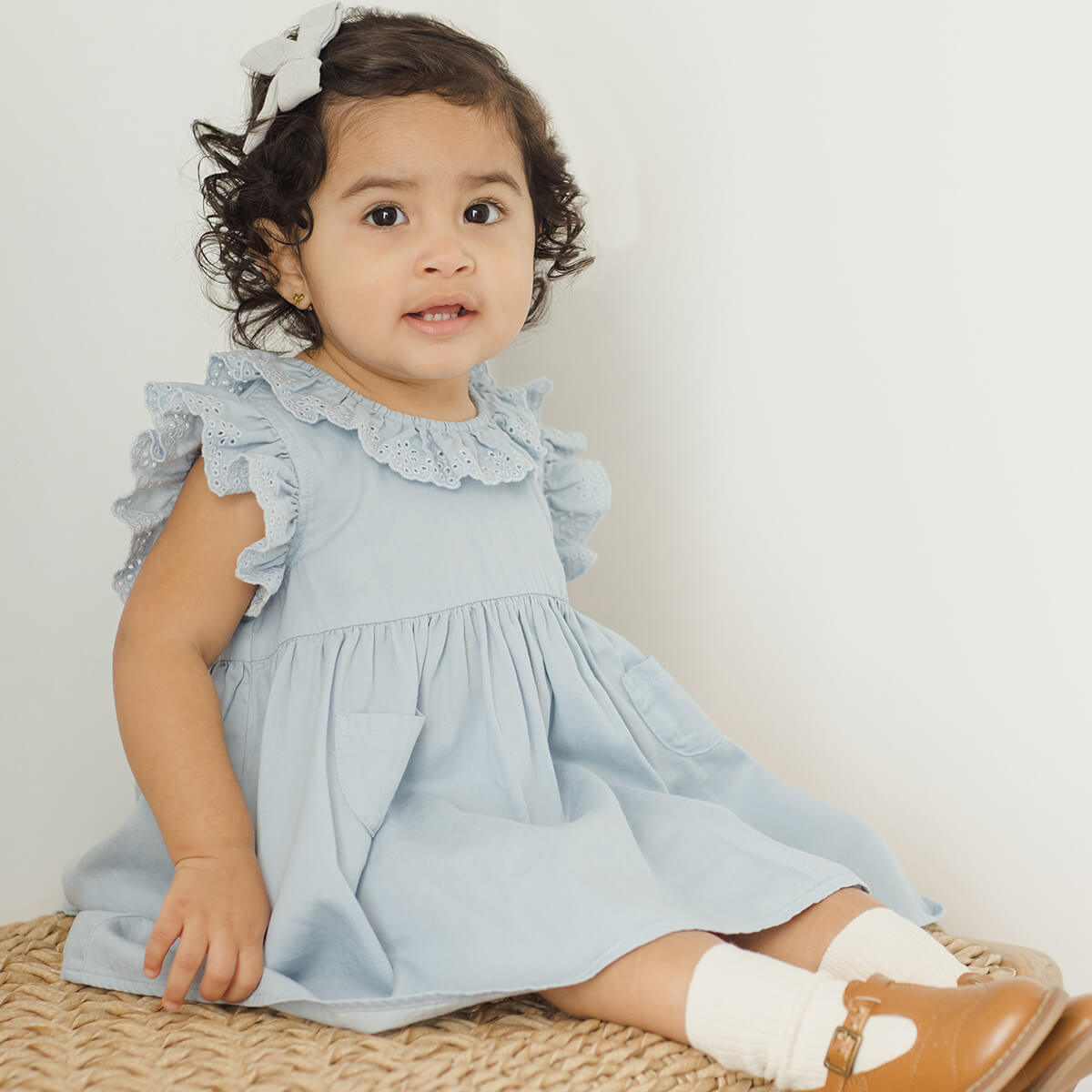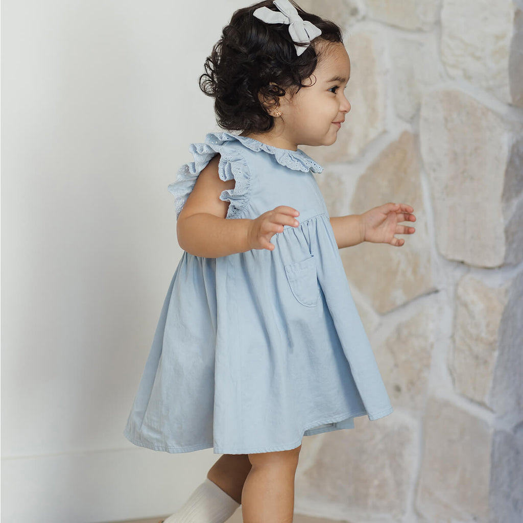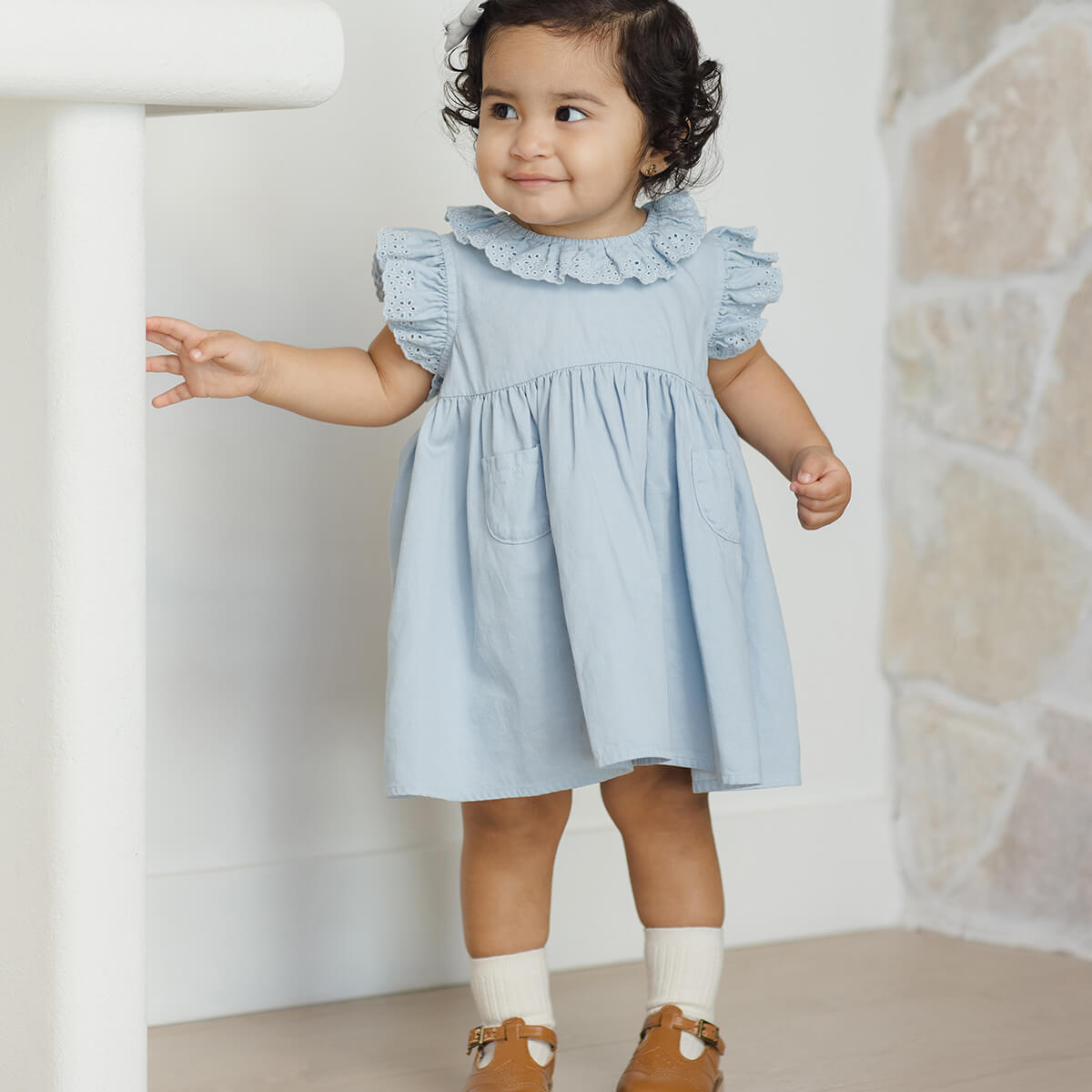 Sophie Dress by Quincy Mae. This dress features a beautiful collar and ruffle sleeves with eyelet detail, and cute front pockets.