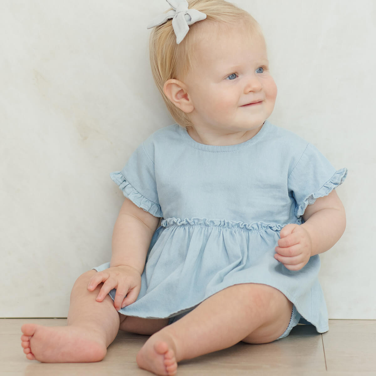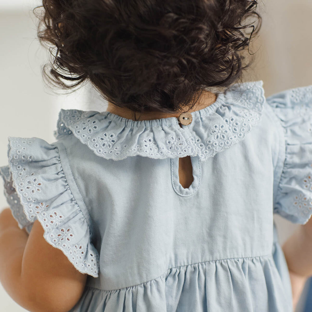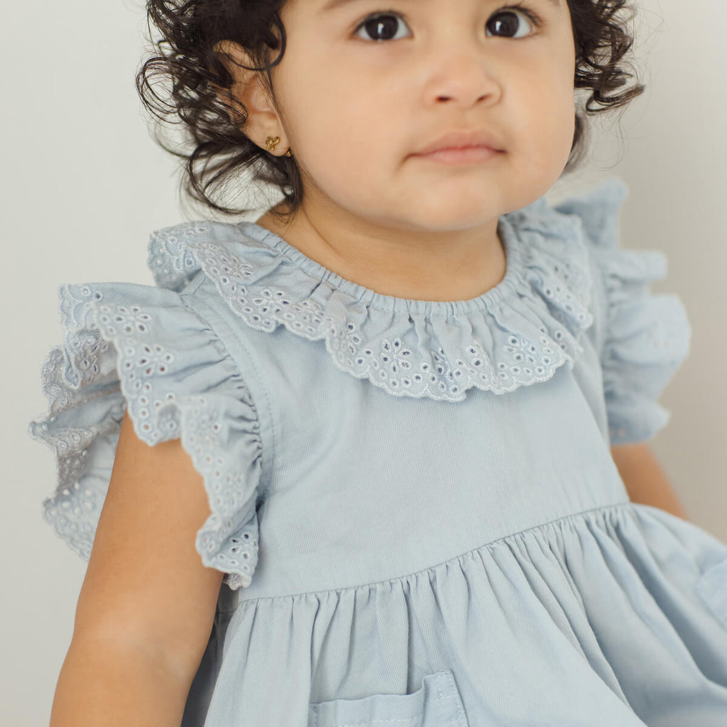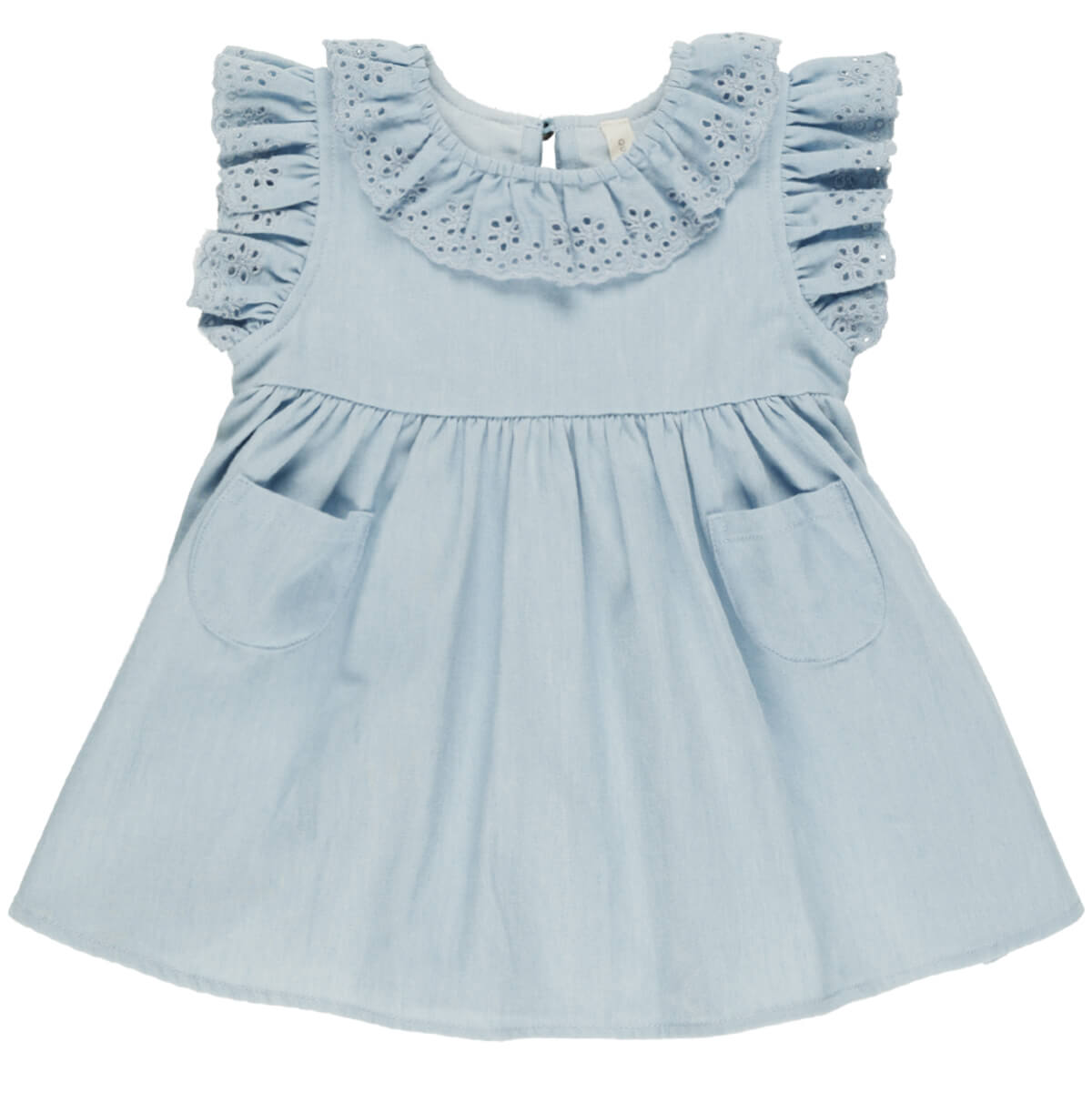 Sophie Dress by Quincy Mae. This dress features a beautiful collar and ruffle sleeves with eyelet detail, and cute front pockets.