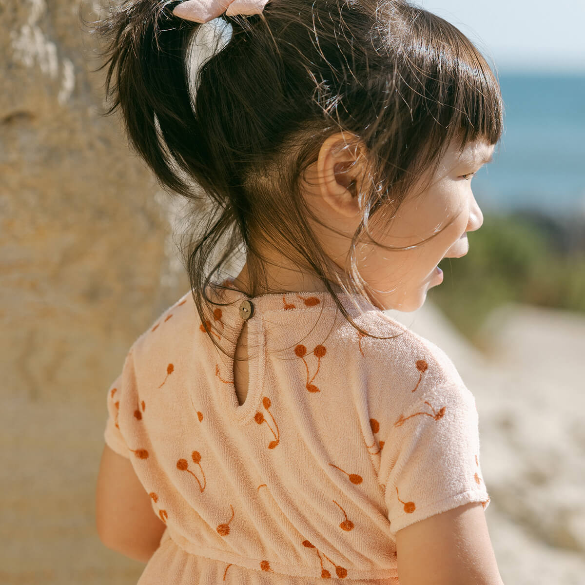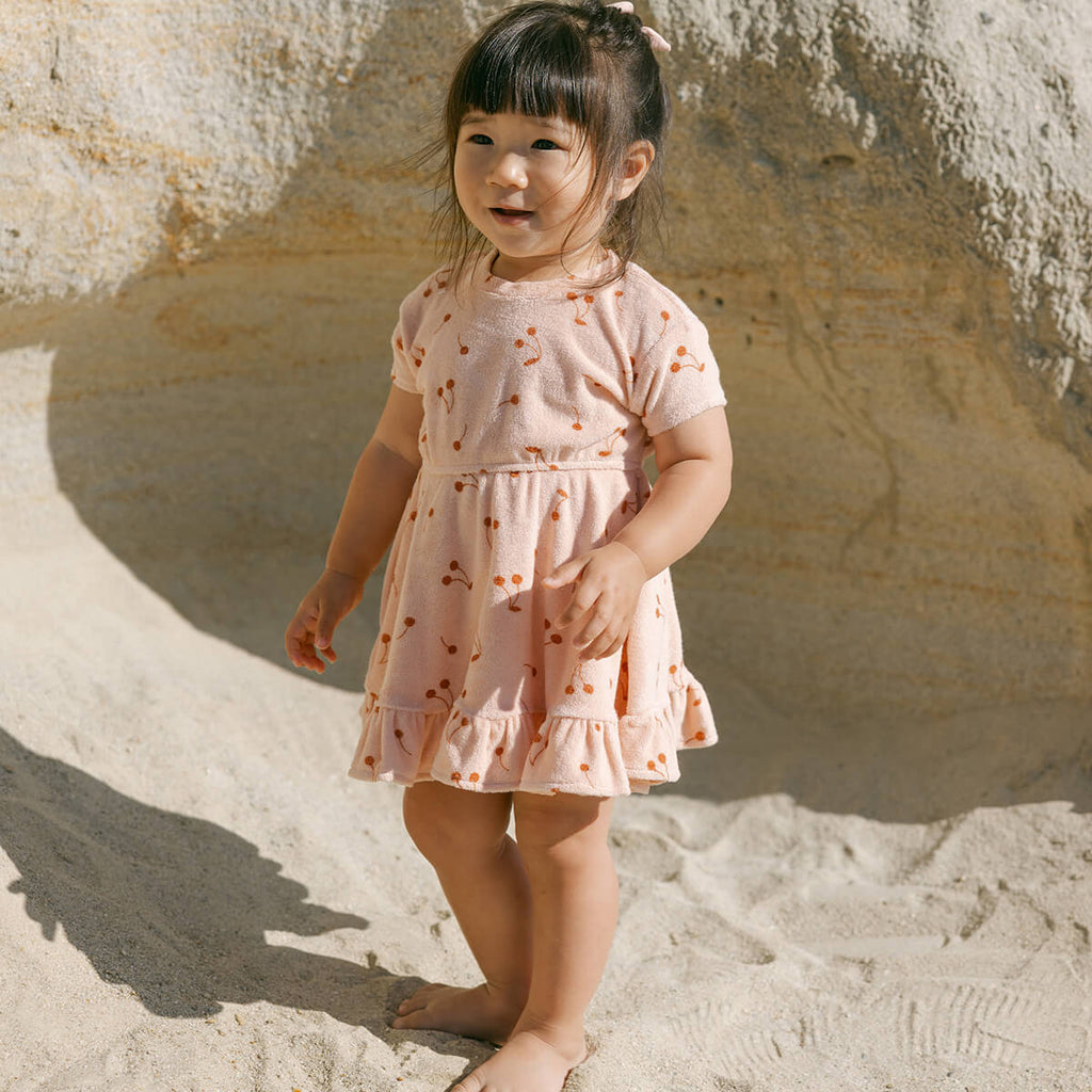 Terry Dress by Quincy Mae. This sweet dress made of terry cloth fabric features ruffle trim, an elasticised waist, and a button keyhole closure for the perfect fit. Coordinating bloomers included with all sizes.