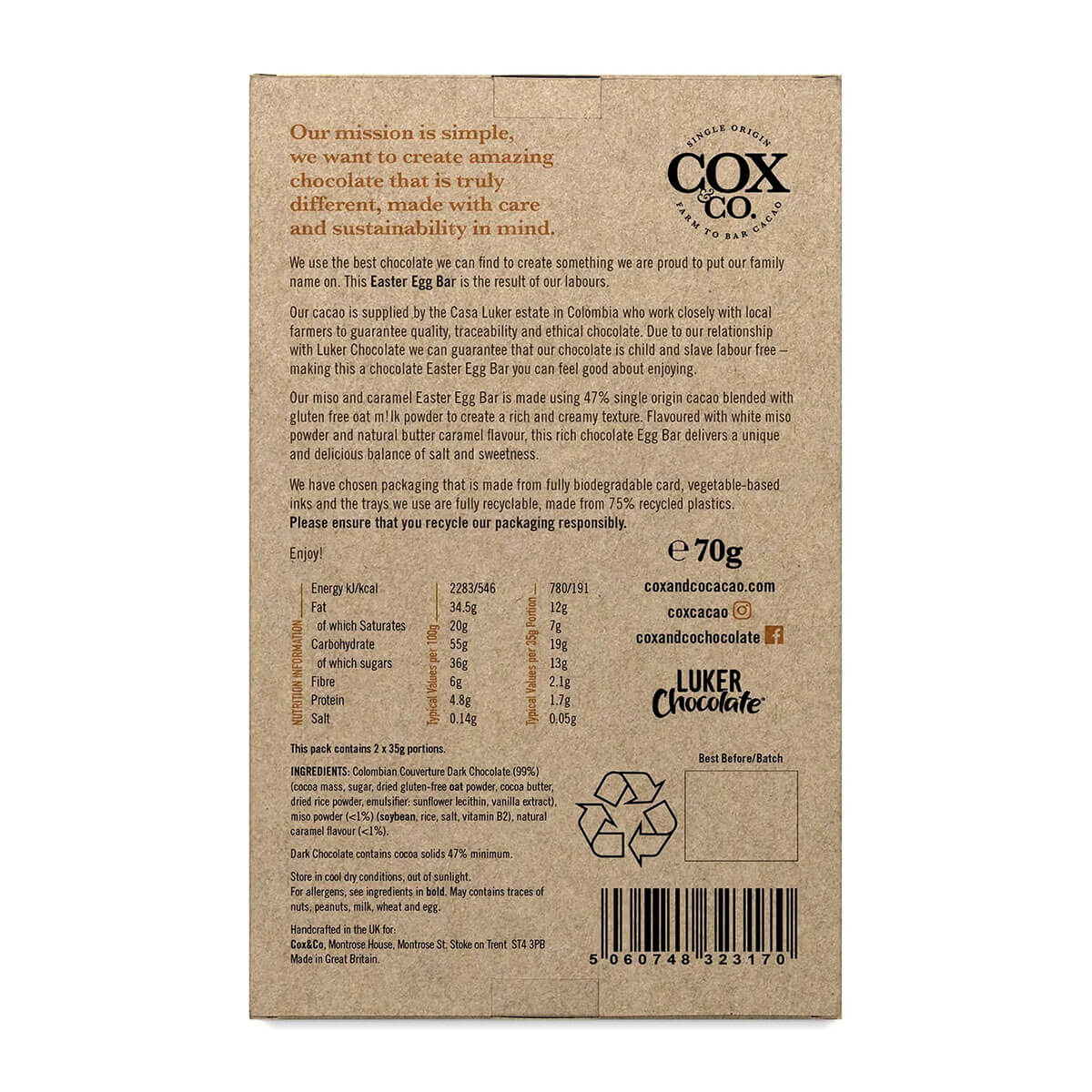 Miso & Caramel 47% Flat Easter Egg Bar by Cox & Co. This gorgeous 70g Flat Easter Egg Bar is made with gifting in mind, pop one in the mail, making them the perfect present for dark chocolate lovers this Easter. The miso and caramel bar is made using 47% single origin Colombian cacao. Flavoured with white miso powder and natural caramel flavour, this rich chocolate bar delivers a unique and delicious balance of saltiness and sweetness. This Easter Egg Bar is vegan friendly. The packaging used is made from fully biodegradable card, vegetable-based inks and compostable film bags made from wood pulp sourced from managed locations, and a 75% recycled plastic tray that is still recyclable. Please recycle responsibly.