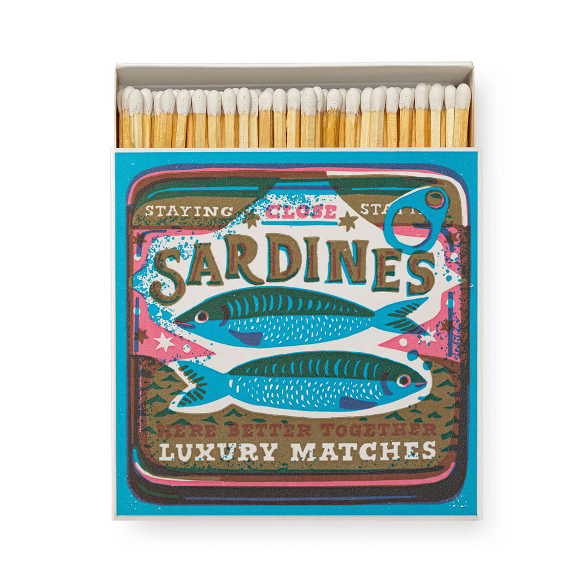 Boxed Matches by Archivist Gallery. Archivist Gallery's signature square matchbox featuring a tin with two sardines on the front in pinks and blues, along with the words 'Sardines, We're Better Together, Luxury Matches.' Striking in every sense, these matchboxes are filled with 125 matchsticks ready to spark a little joy. Designed to add character to coffee tables, mantelpieces, and gift drawers, each box is a blend of function and flair.
