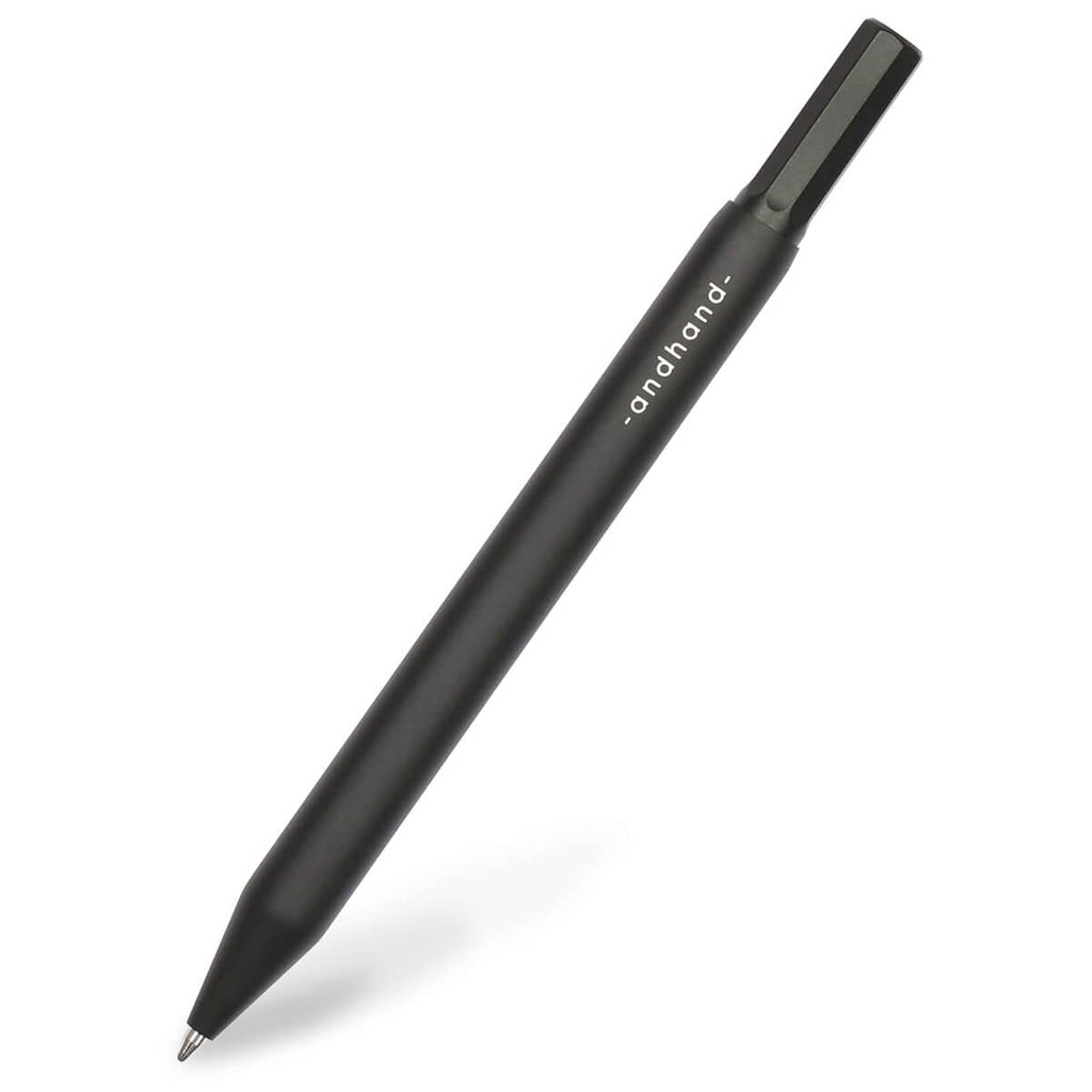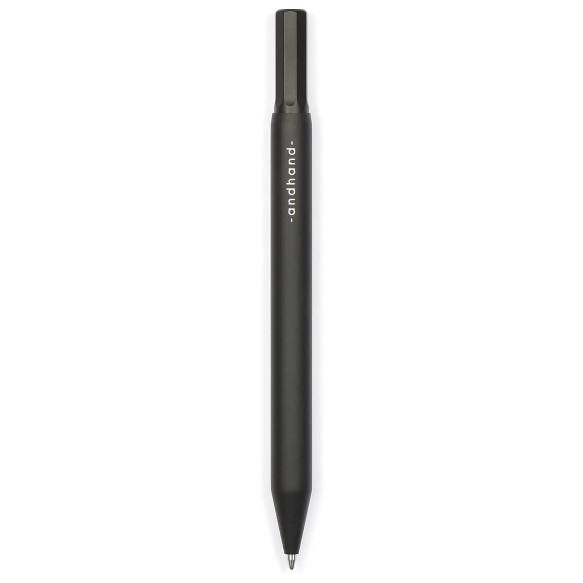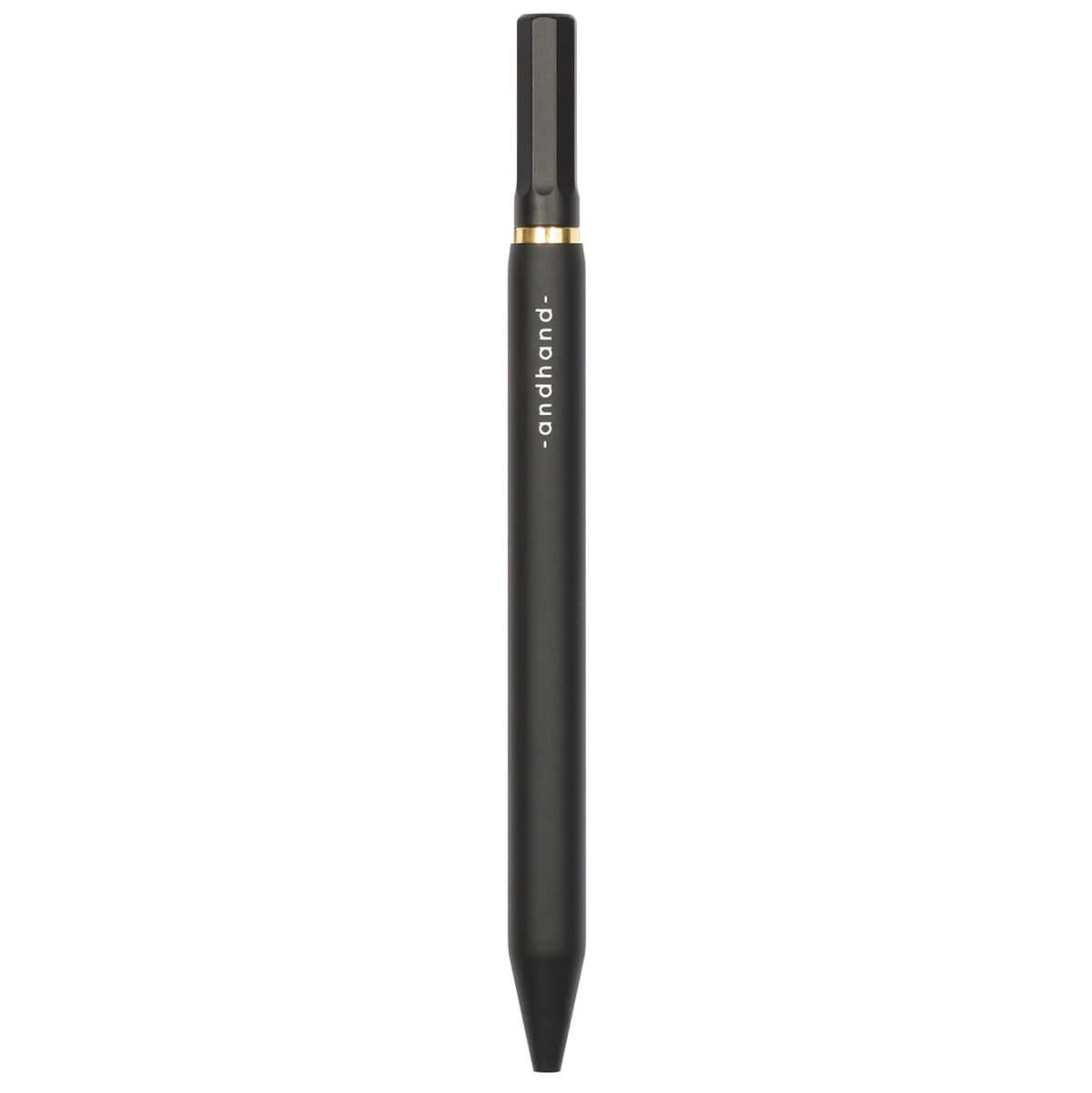 Method Pen in Black by Andhand. The method pen is a timeless piece with modern appeal. The all metal construction of this retractable black pen has been crafted with precision and features an elegant twist movement revealing a contrast of brass in its retracted position.