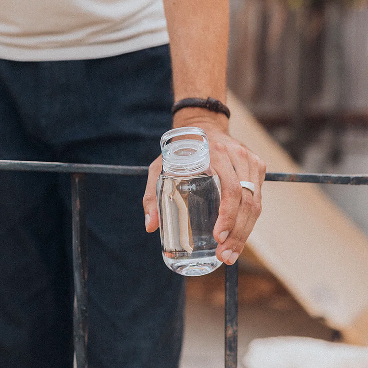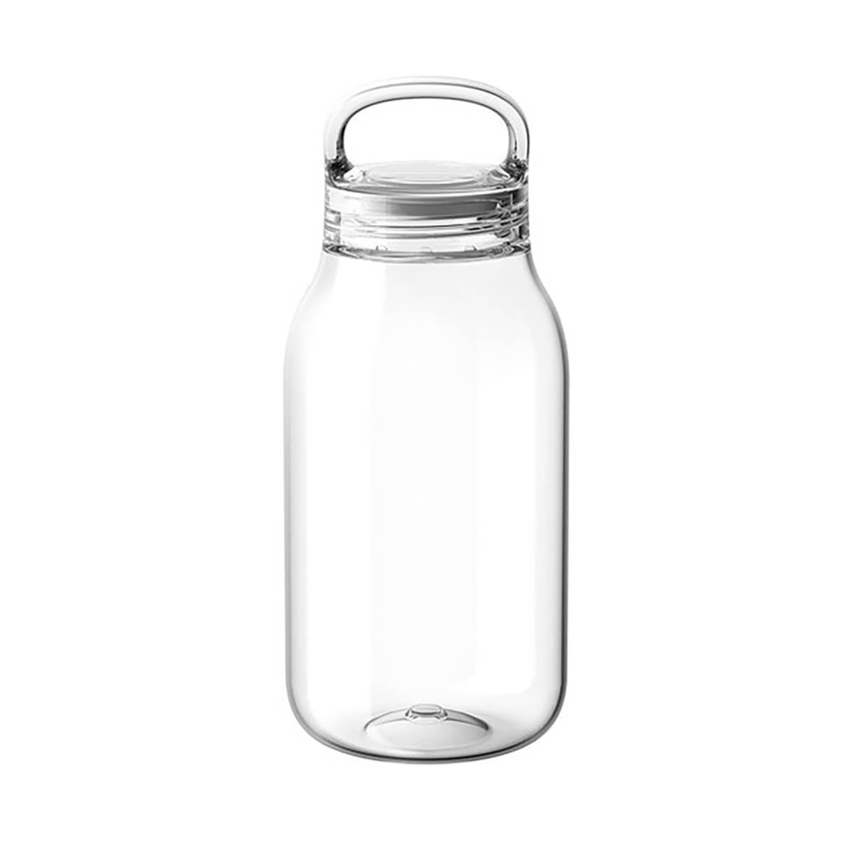 Water Bottle by Kinto. Lightweight and compact, the Kinto lets you hydrate effortlessly. Made of high quality transparent copolyester, it is durable and scratch resistant. The lid opens with a single twist and has a handle that is comfortable to hold, making it convenient to carry around. The bottle's beautiful form and transparency stands out when you put water inside. This handy small size easily fits into a handbag.
