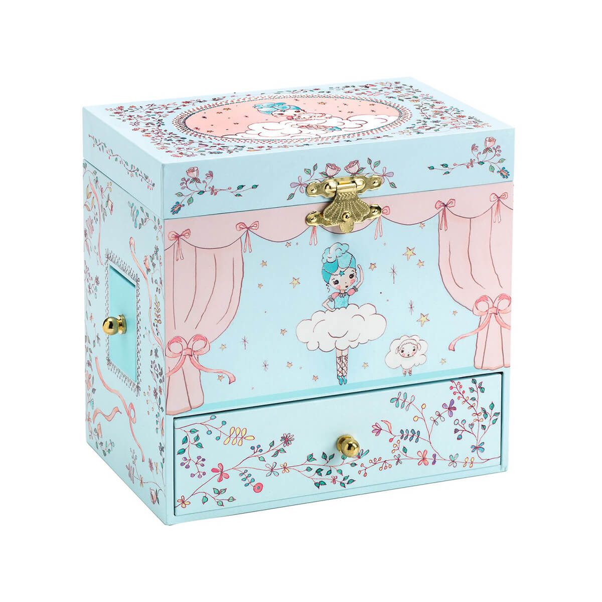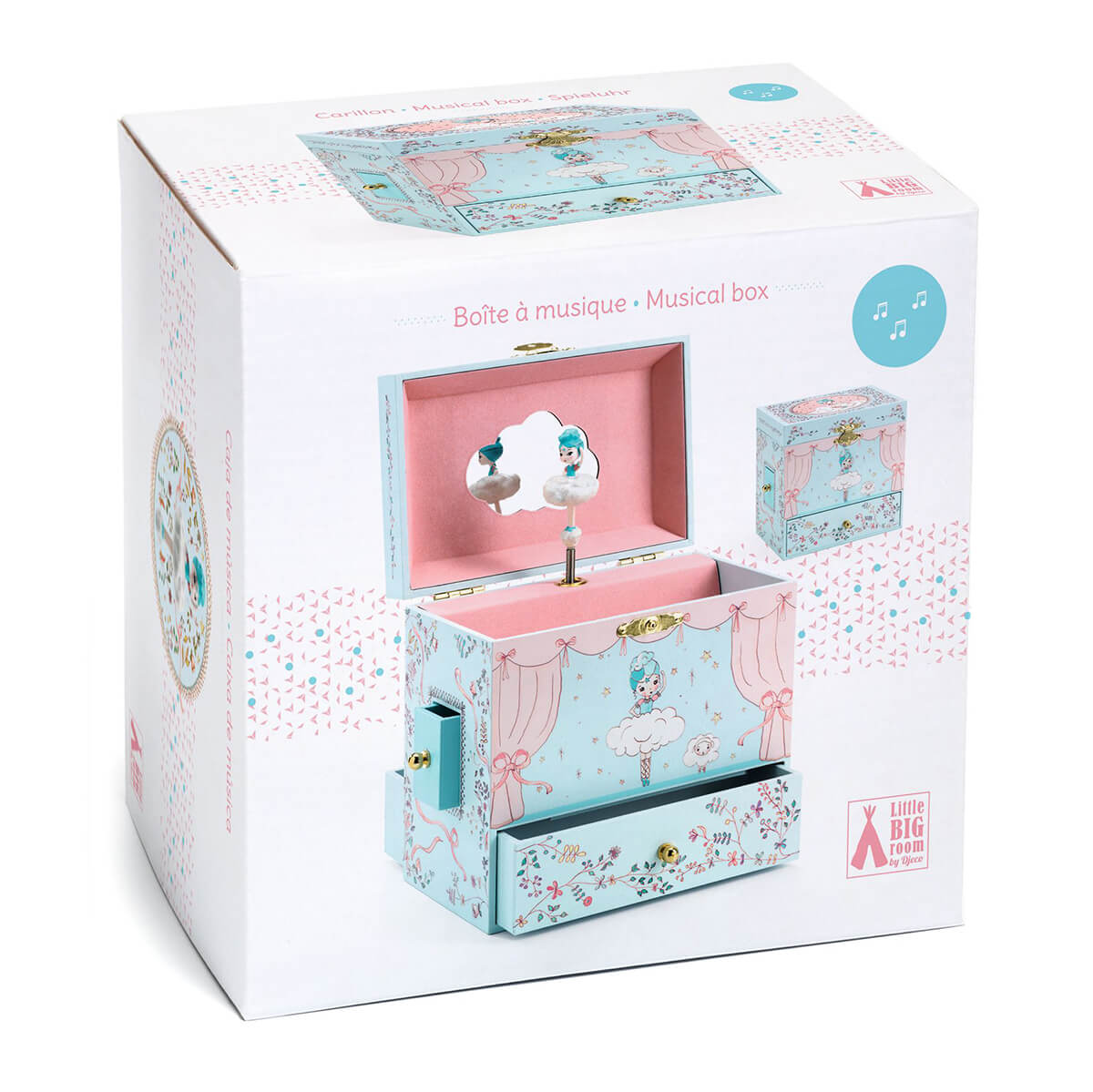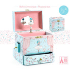 Ballerina On Stage Music Box by Djeco. Ballerina on Stage is a beautifully illustrated music box with four drawers to store her jewels and secrets. Turn the key, open the box, and everything comes to life! A beautiful, intricately sculpted figurine spins and is reflected in a silhouetted mirror to the sound of Mozart's "The Magic Flute."