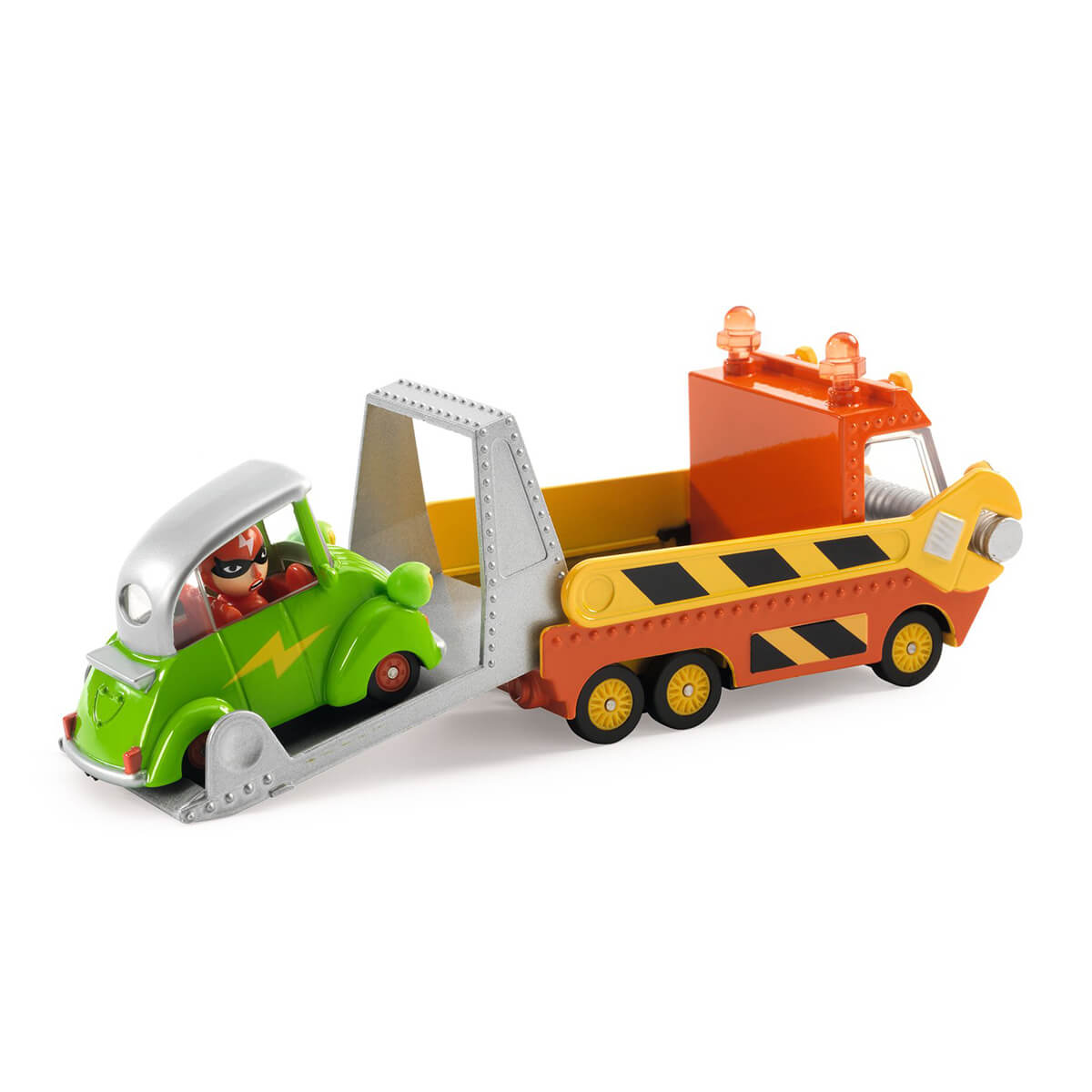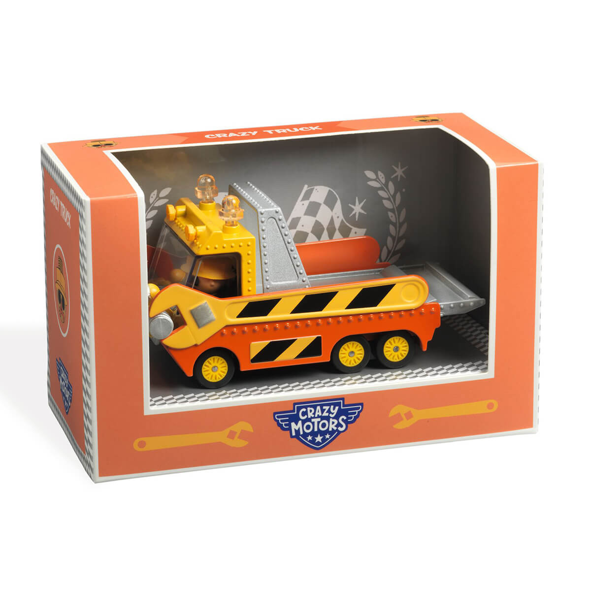 Crazy Motors Crazy Truck by Djeco. Broken down vehicle? Quick, the Crazy Truck tow truck is on its way to help! Robust and imposing, it tows the broken-down vehicle onto its platform and transports it to the nearest garage for quick repairs. Simply essential!
