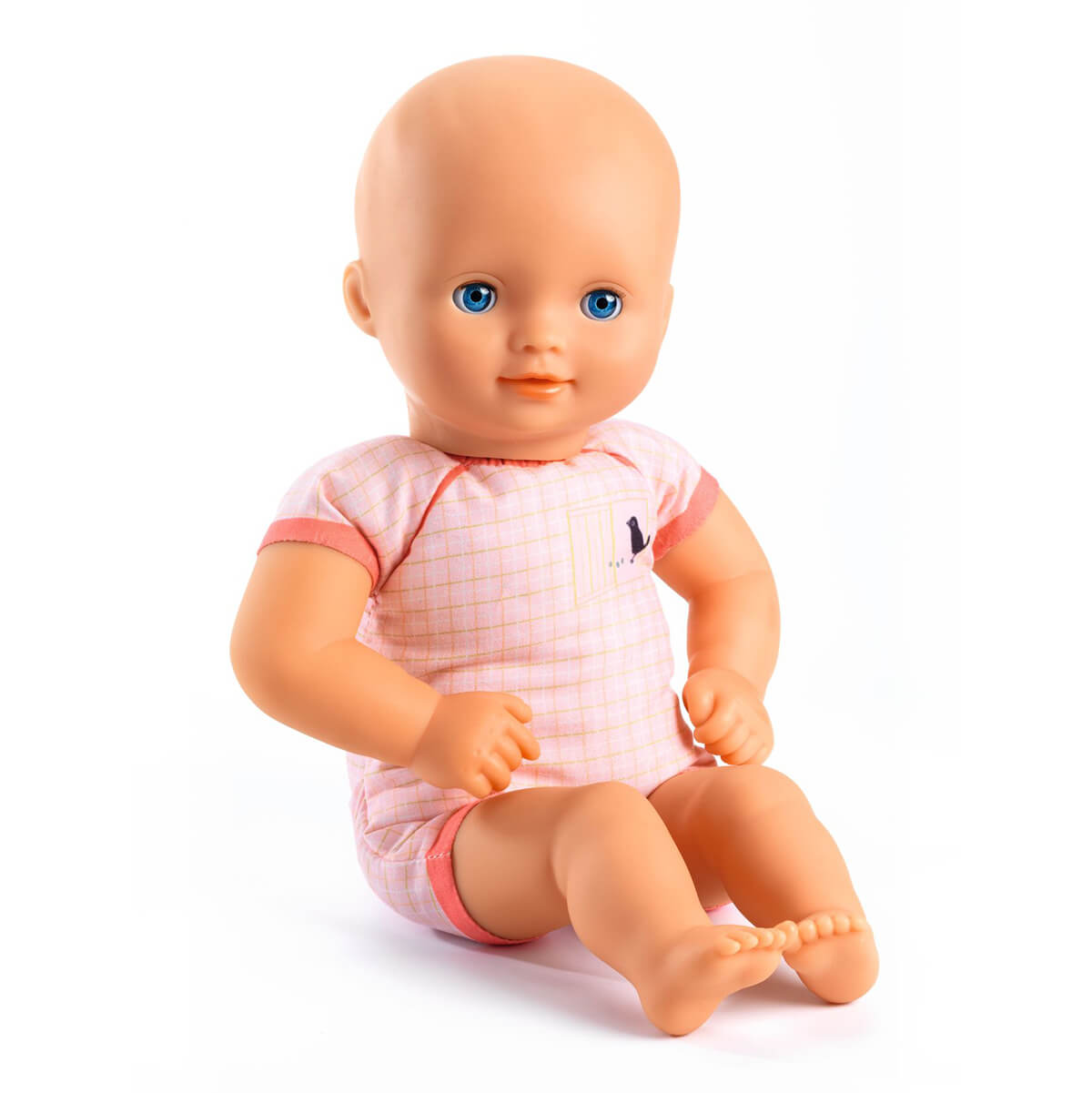 Pomea Baby Dahlia Doll in Purple by Djeco. With her big dark blue eyes and angelic face, Baby Dahlia Purple is a doll for children from 18 months. She is light and her size (32 cm) is perfectly suited to small arms. Her flexible body, printed with a bodysuit, allows her to be positioned like a real baby. Her face, arms and legs are made of very soft vinyl that is pleasant to the touch. Her sleepy eyes close when it is laid down on its back. This baby doll is dressed in a dress and a scarf on the head, made from a beautiful 100% cotton double-gauze material.
