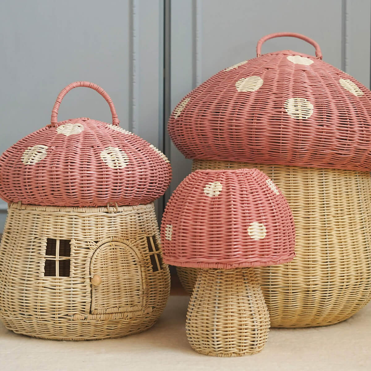 Rattan Mushroom Doll House by Olli Ella. A cozy little mushroom home, just waiting for tiny adventurers to move in. The Mushroom Doll House in Musk is the soft pink playhouse your Holdie Folk or Dinky Dinkums have been dreaming of! Handwoven from natural rattan, this magical mushroom features two playful levels, one at ground level, and a second floor on a shelf for all kinds of stories to unfold. The wooden door swings open with ease, while the two square windows let your little one peek inside at all the magic waiting to happen. The wooden button clasps on the side make opening and closing the mushroom house a breeze, transforming it from a sweet decor piece into the stage for endless adventures.