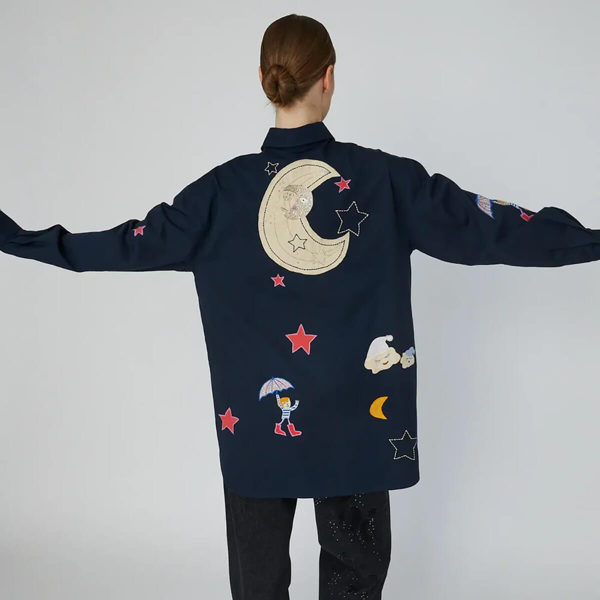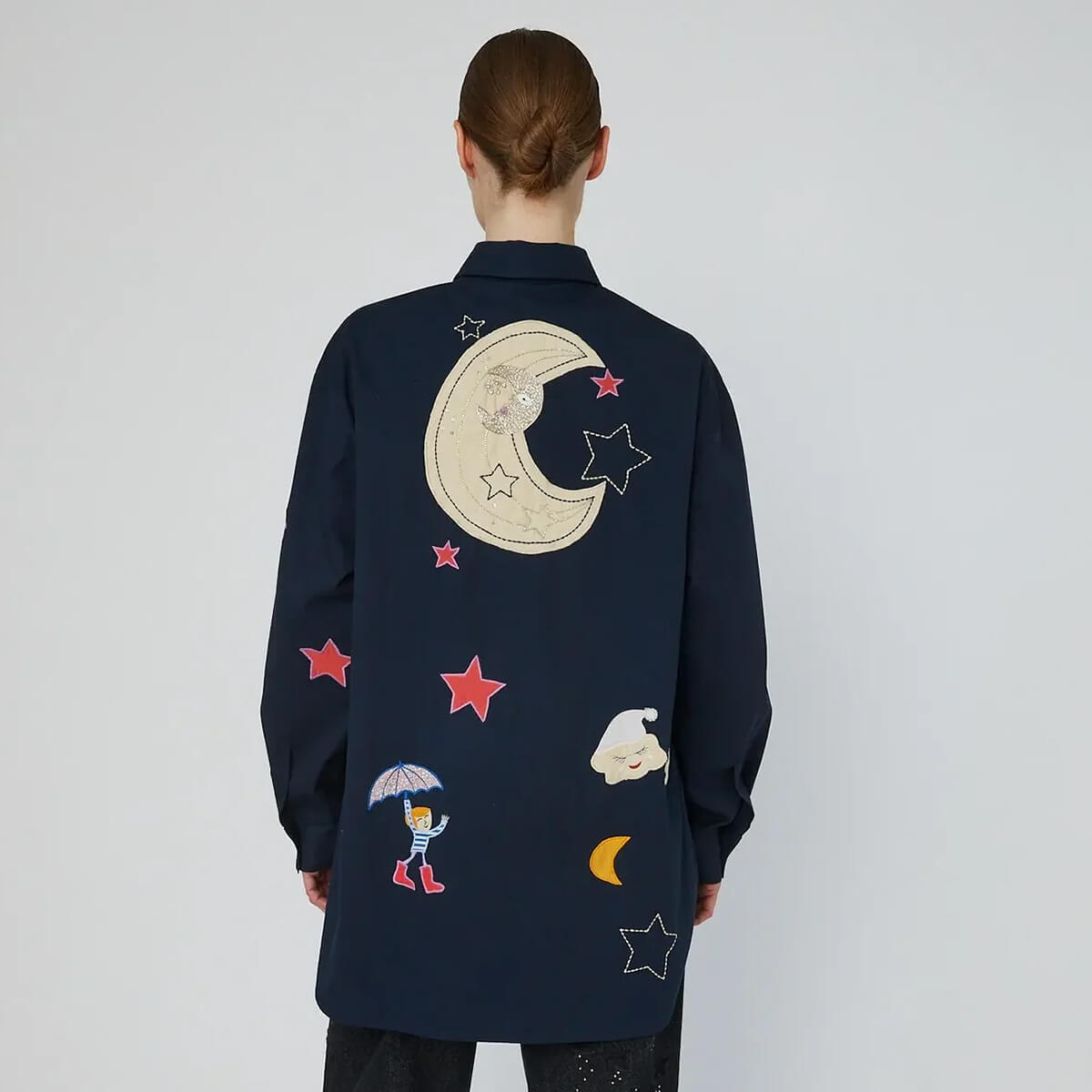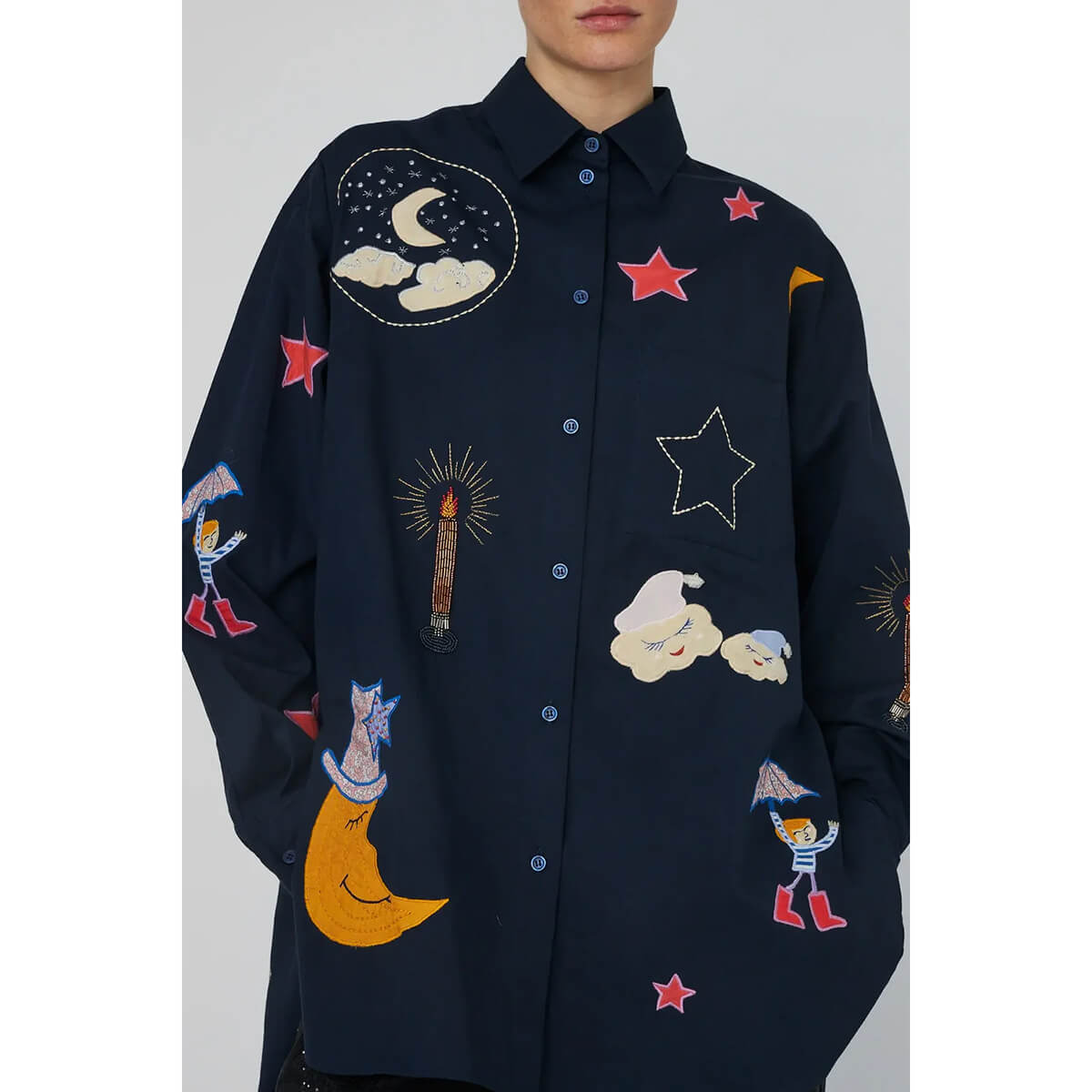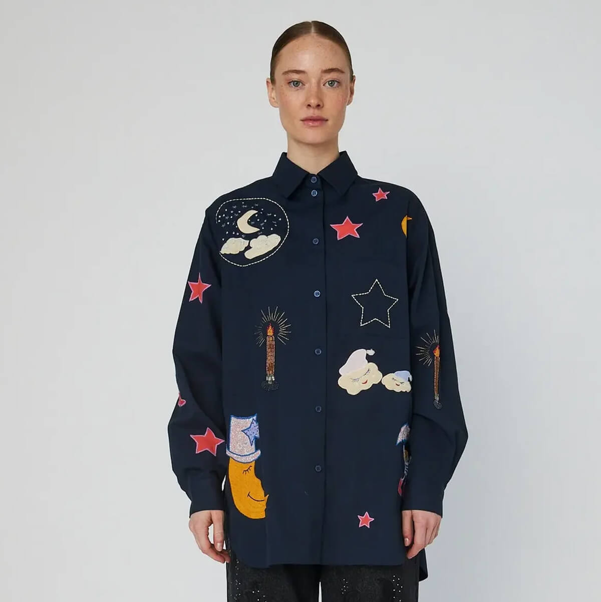 Bead Embellished Shirt by Stella Nova. Oversized shirt with hand-embroidered motifs. The shirt features a classic collar, long sleeves with a cuff and a front button closure.