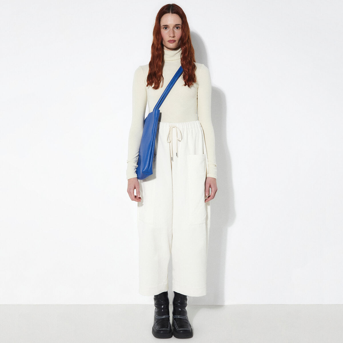Cadec Bag in Blue by Rita Row. Leather bag featuring a long strap and an inside side pocket. Closes with a magnetic clasp. Can be worn across the body or over the shoulder.