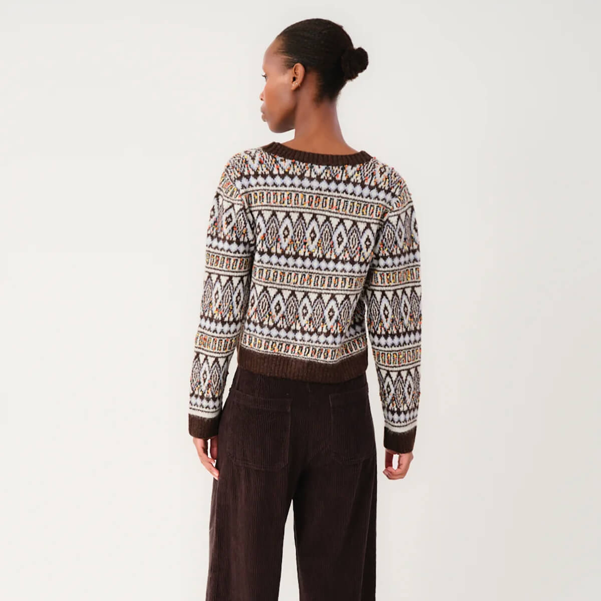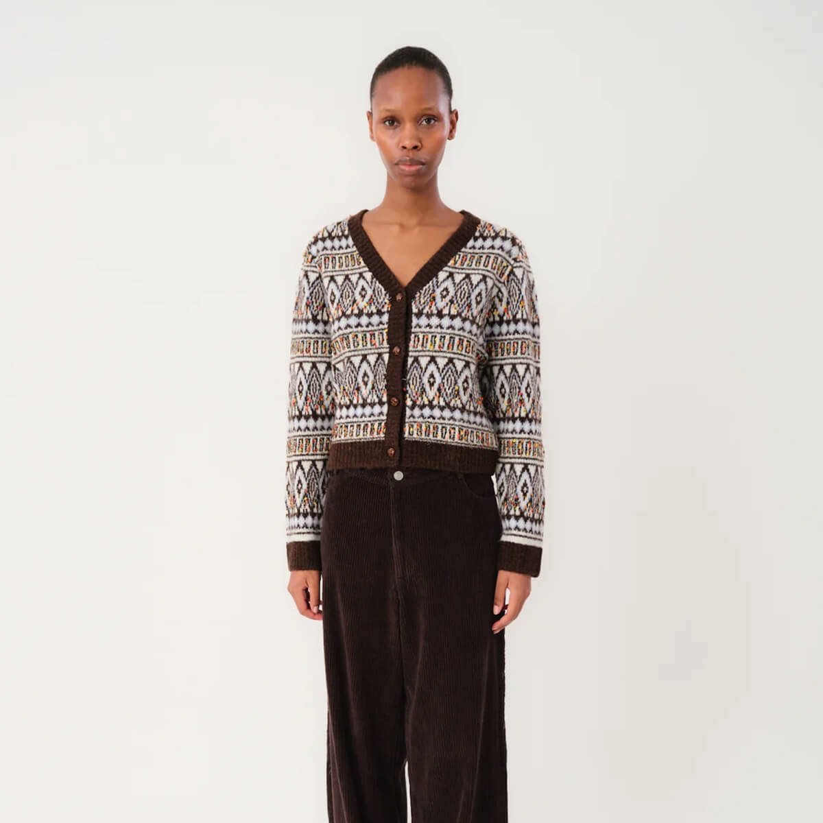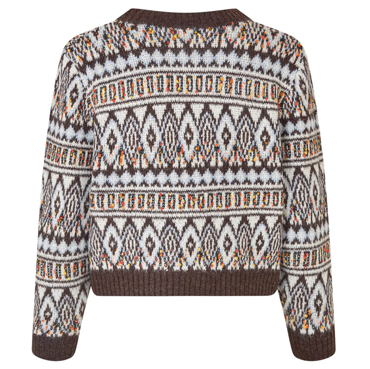 Saxo Knit Cardigan by Lollys Laundry. The Saxo cardigan is a knitted cardigan with a distinctive pattern and colourful details. The cardigan is designed in a warm brown base with contrast knit in off-white and multicoloured specks, creating a retro-inspired look. The short silhouette and wide ribbed edges add a modern shape, while the V-neckline, long sleeves and decorative buttons complete the style.