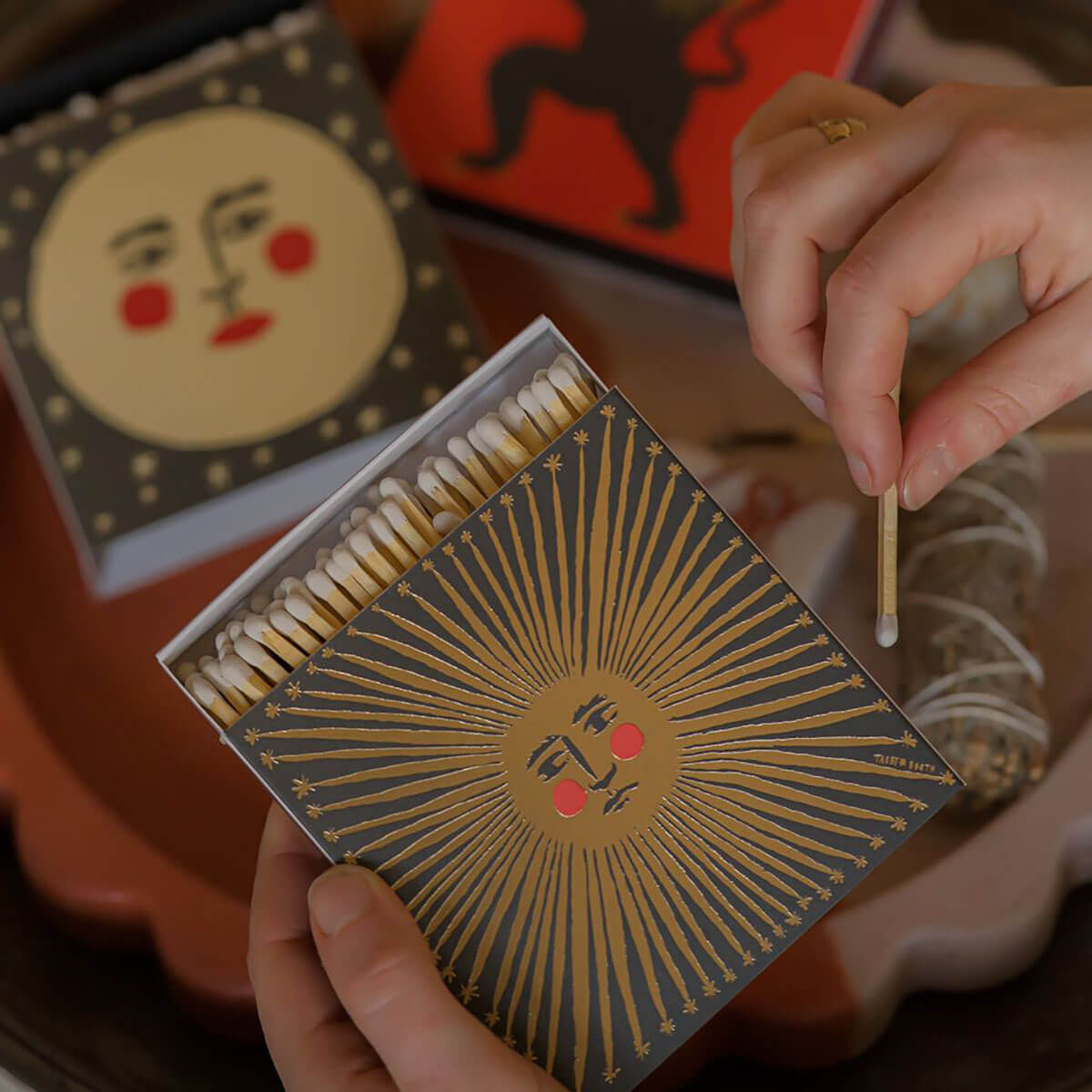 Boxed Matches by Archivist Gallery. Archivist Gallery's signature square matchbox featuring a brassy gold foil sun with an illustrated face and rosy red cheeks. Designed by Tabby Booth. Striking in every sense, these matchboxes are filled with 125 matchsticks ready to spark a little joy. Designed to add character to coffee tables, mantelpieces, and gift drawers, each box is a blend of function and flair.