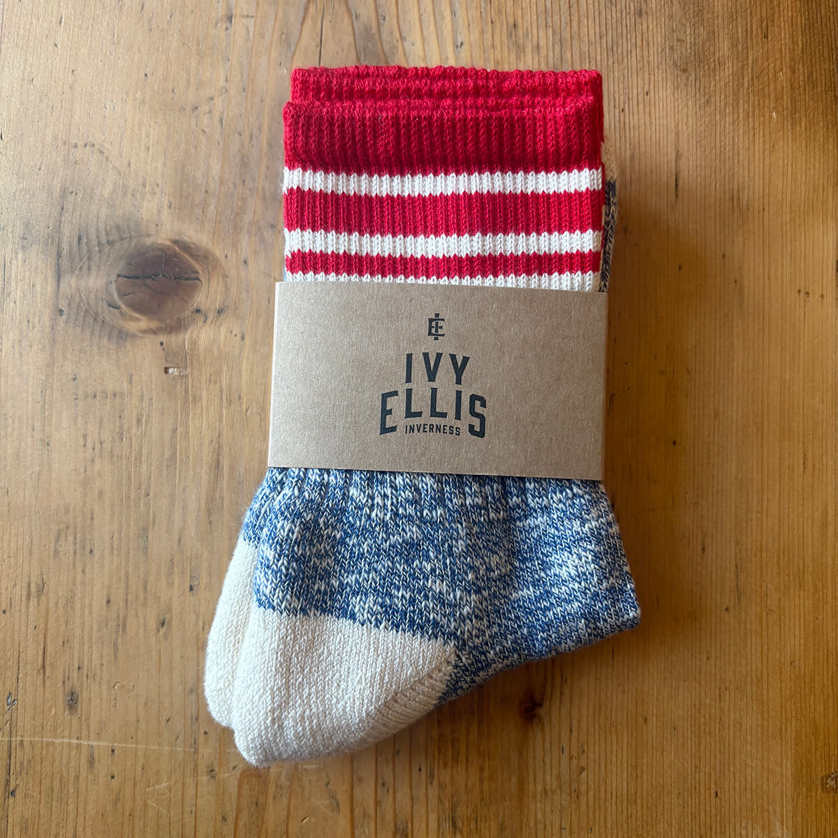 The Dornoch women's highland coastine slub socks by Ivy Ellis. Handcrafted with care, The Dornoch socks are made from ribbed navy blue slub yarn, providing a unique texture and visual appeal. Featuring a signature vintage cream heel and toe, these socks are finished with a soft elasticated top with red stripes for extra hold, ensuring they stay in place comfortably throughout the day.