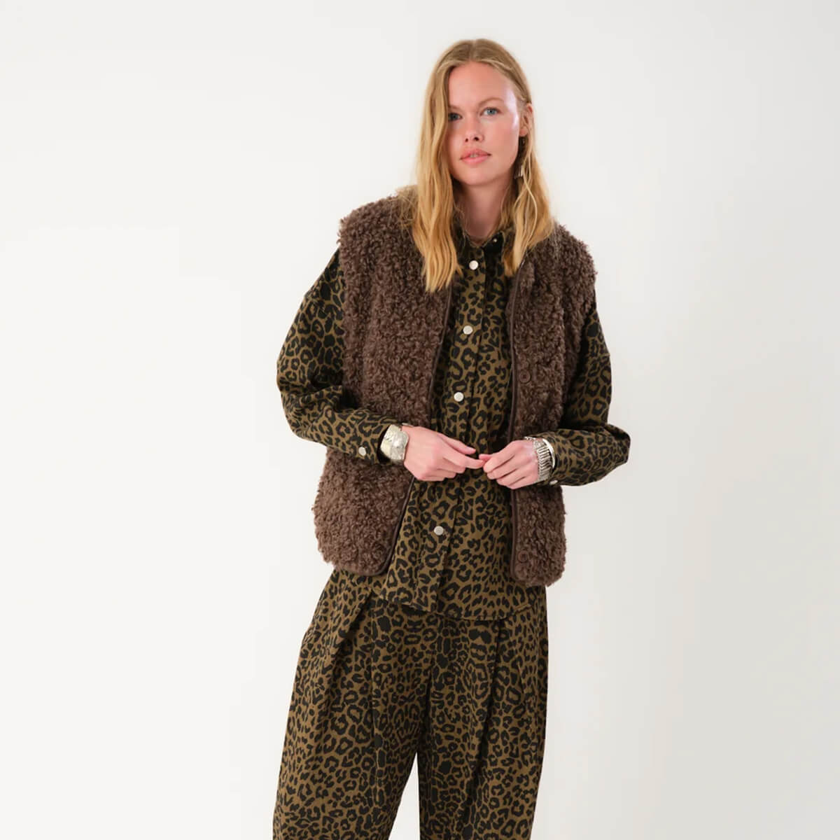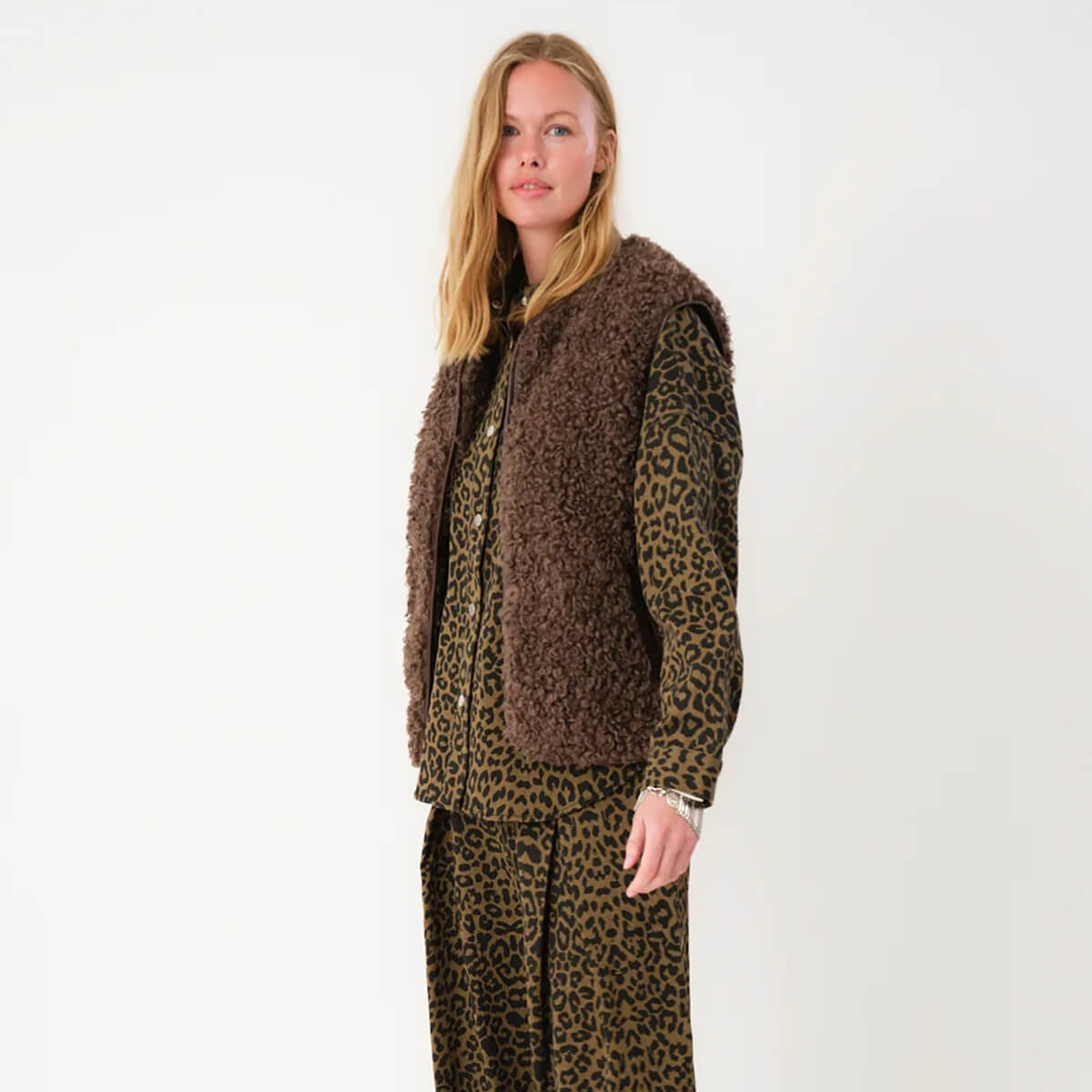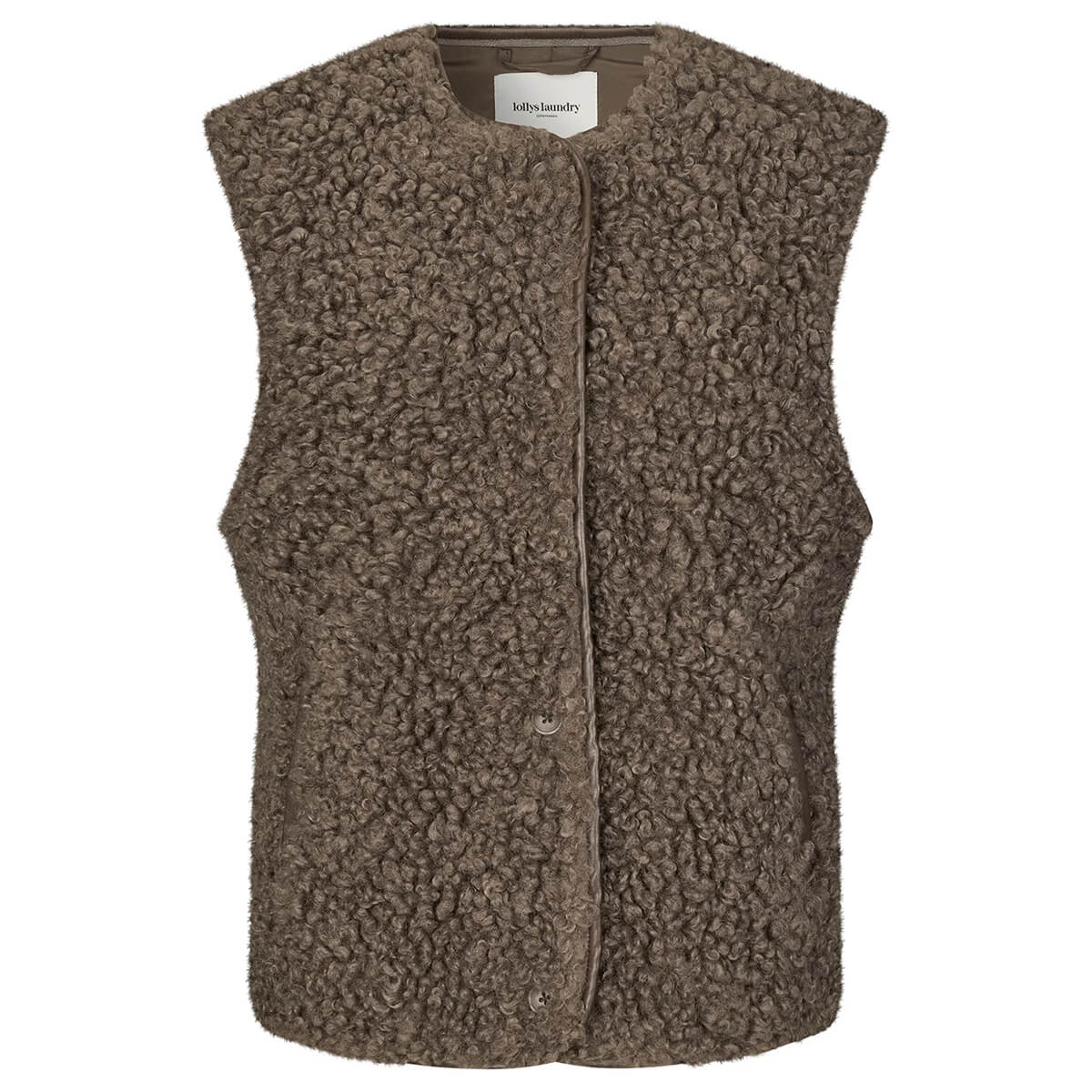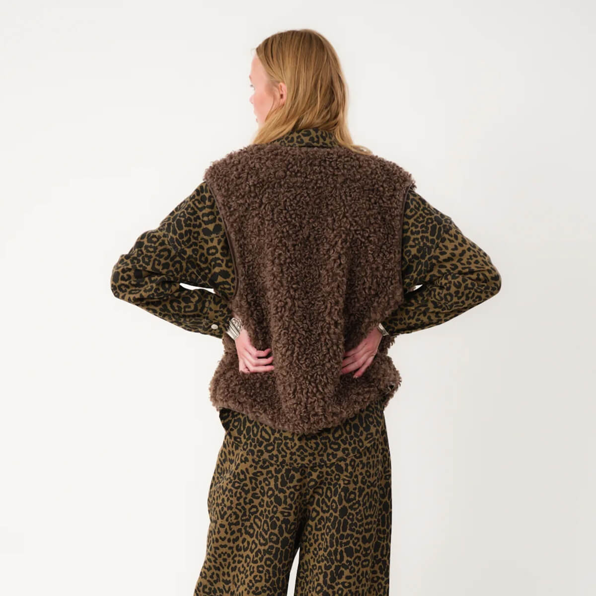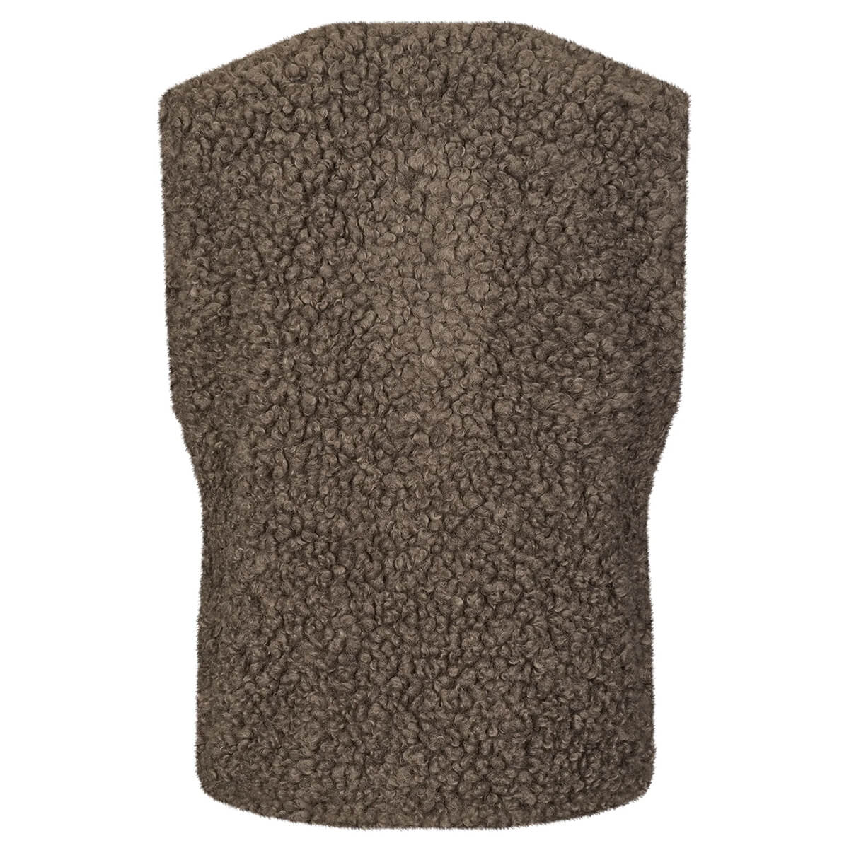 Vada Vest by Lollys Laundry. This soft and cosy teddy vest features a round neckline and front button closure. The pockets and edges are finished with tone-on-tone faux leather trims, adding an exclusive touch. It can also be styled over jackets for a cool layered look and extra warmth.